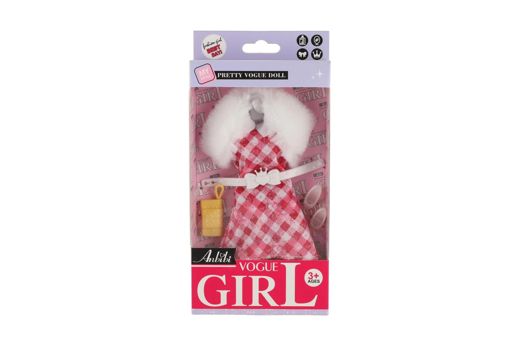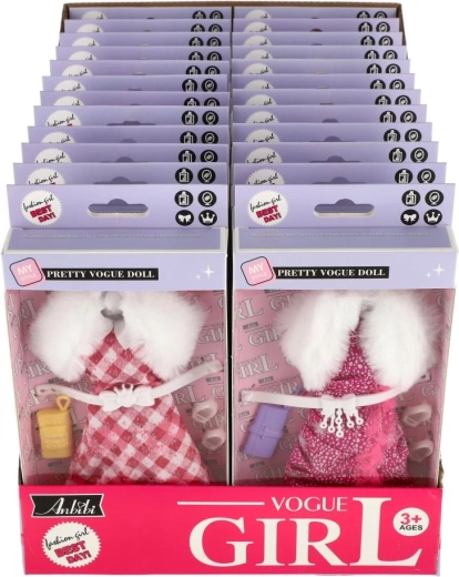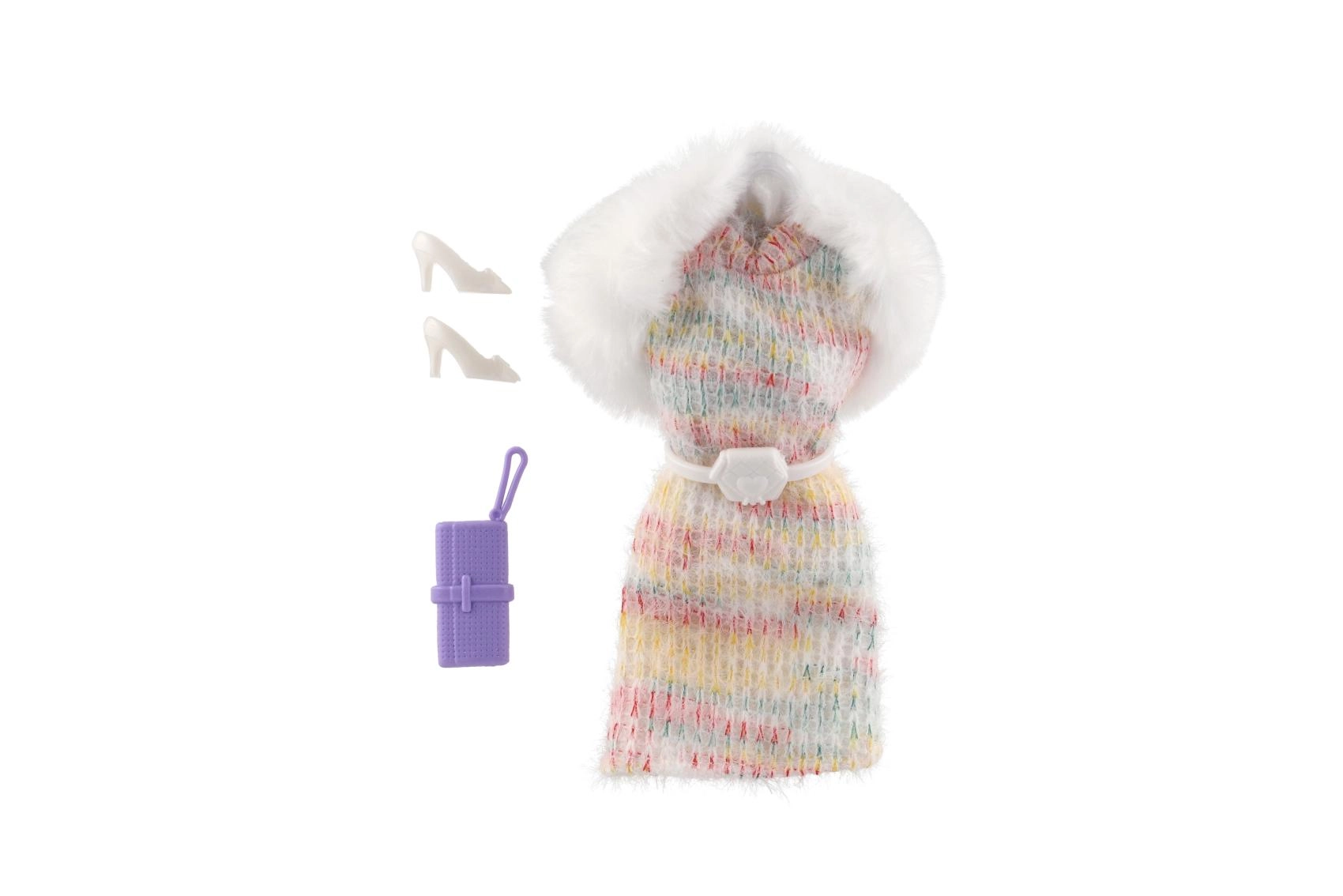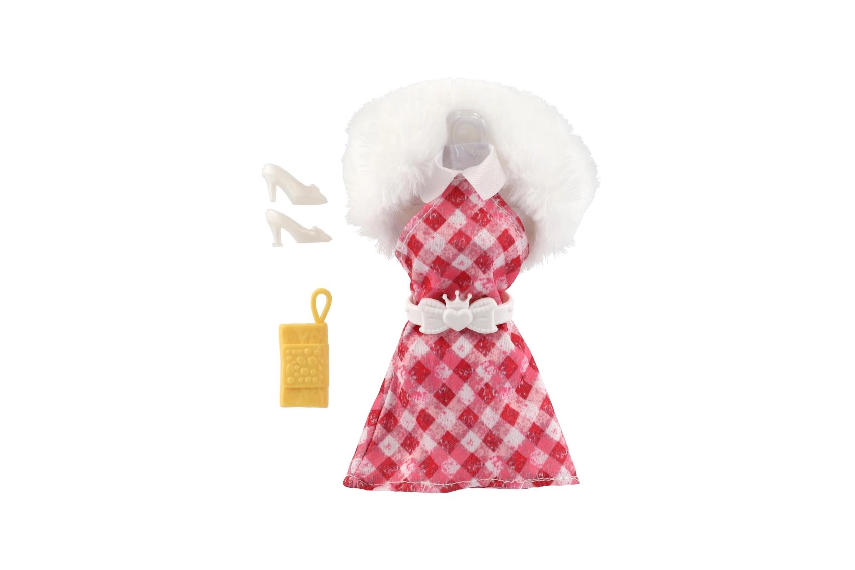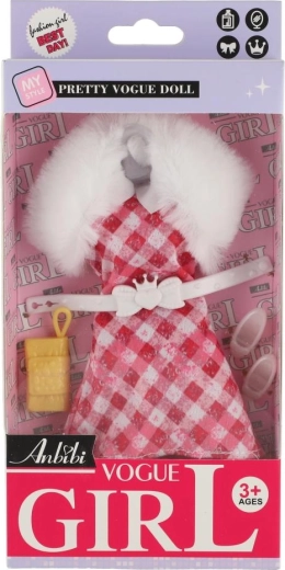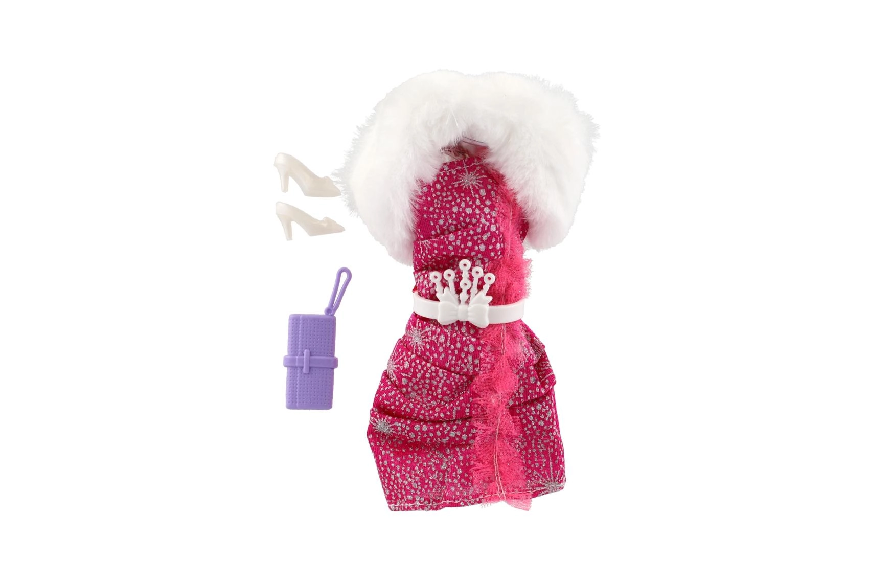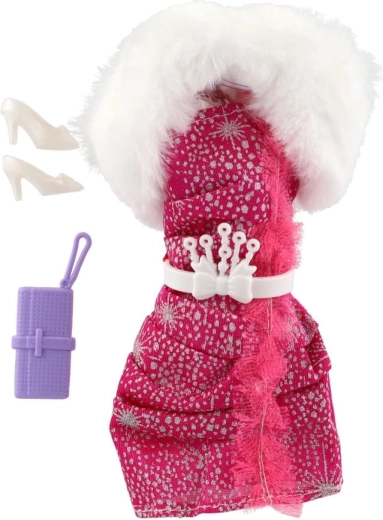 Des robes roses, à motifs et à carreaux avec un col blanc effet fausse fourrure offrent une allure luxueuse et donnent à la poupée un look de fête.