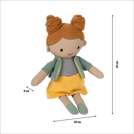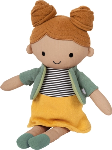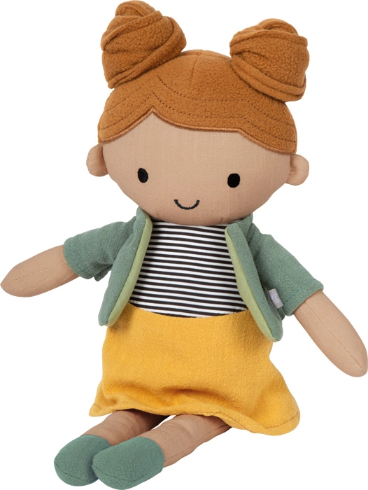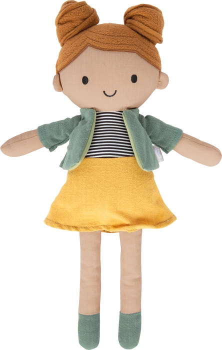 Mája porte une jupe jaune, un haut rayé et un petit cardigan/veste vert faciles à enfiler et à retirer. Cela entraîne naturellement la motricité fine ainsi que l’autonomie. La poupée est lavable à la main, ce qui lui permet de conserver sa forme, sa propreté et sa longue durée de vie.