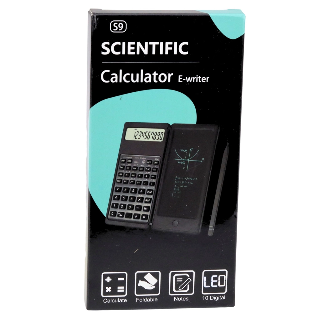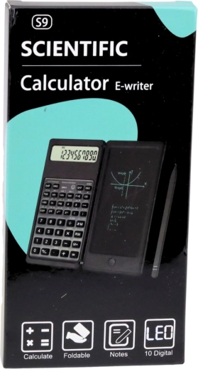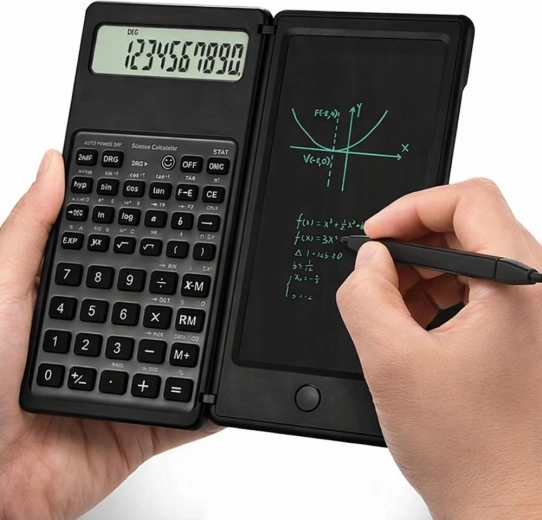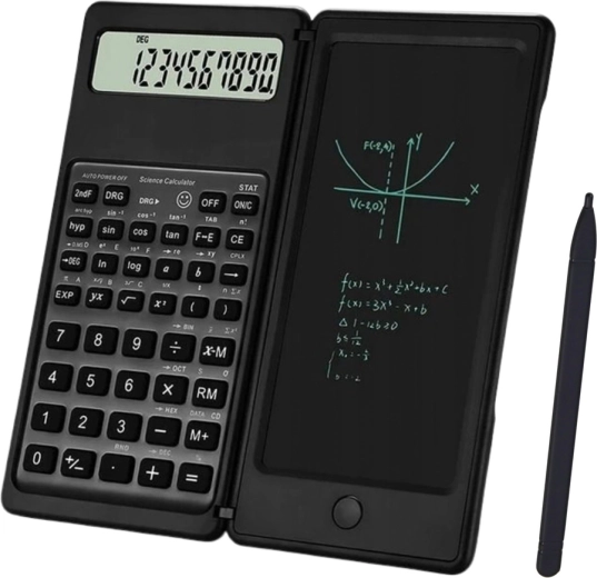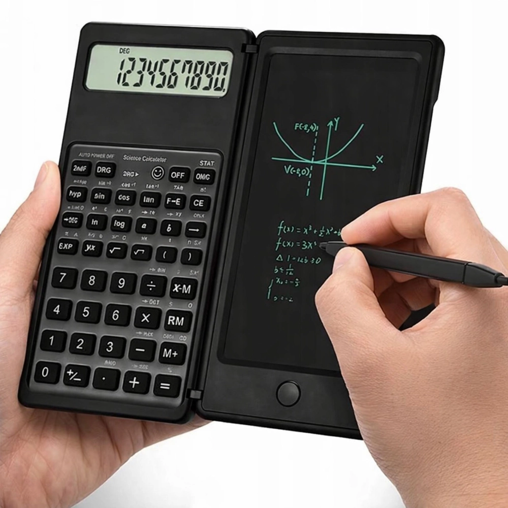 Calculatrice scientifique compacte avec ardoise LCD d’écriture intégrée et stylet, combinant calculs et prises de notes rapides en un seul appareil. Elle offre un écran 10 chiffres, un design pliable et robuste et un bouton d’effacement pour supprimer instantanément croquis et calculs – idéale pour l’école, le bureau et le travail quotidien en mathématiques.
