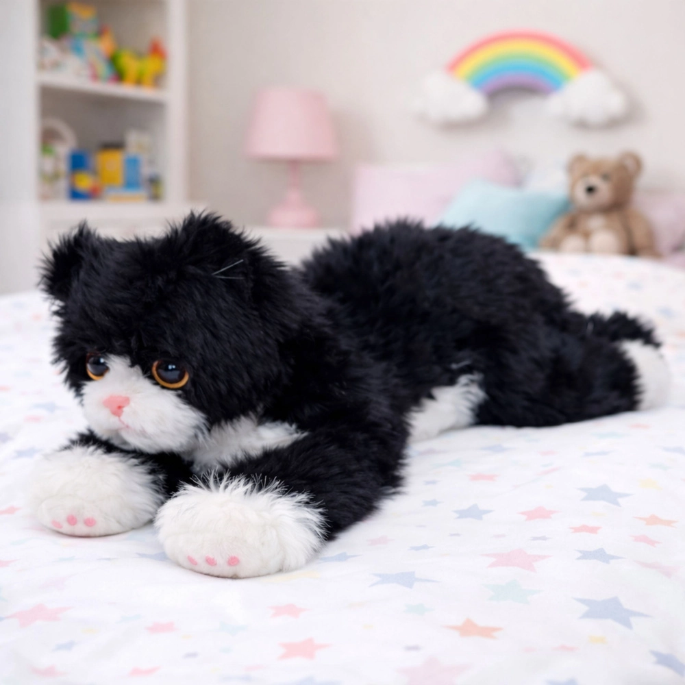 Adorable chat en peluche noir‑et‑blanc, doux, moelleux et prêt pour les câlins. Grâce à sa réalisation réaliste, sa fourrure douce et ses matériaux sûrs et agréables, les enfants l’adoreront vite comme compagnon de jeu et de nuit.