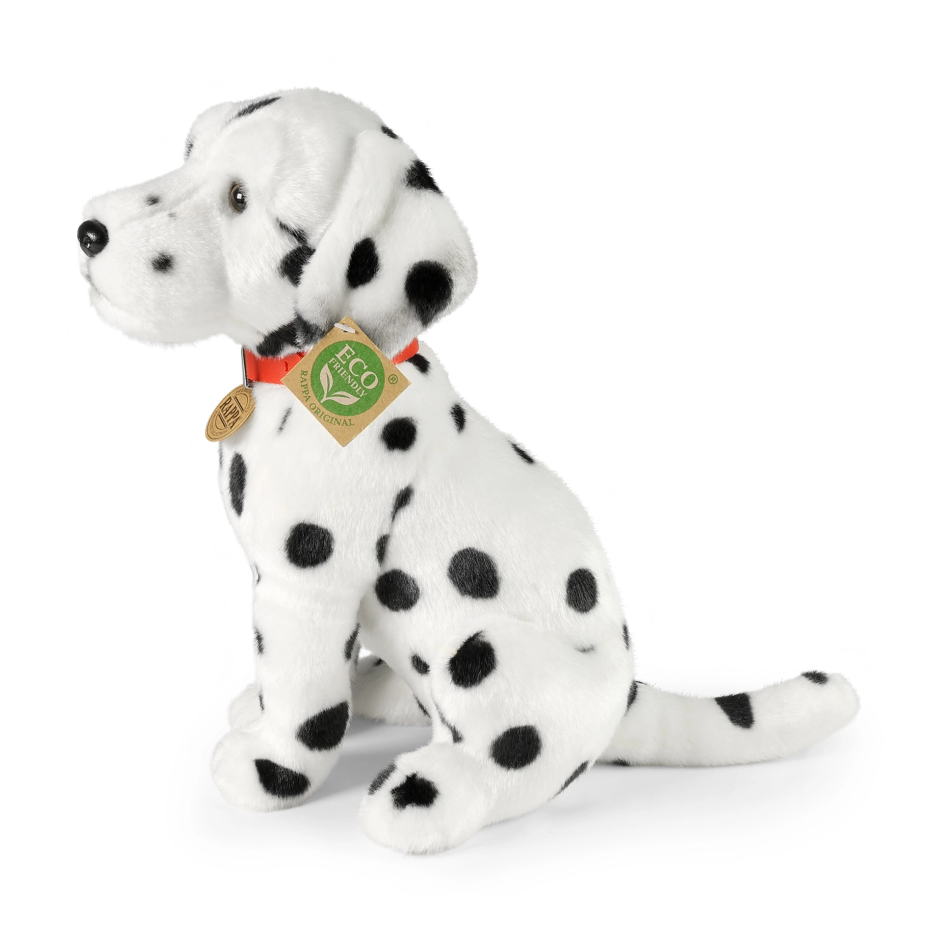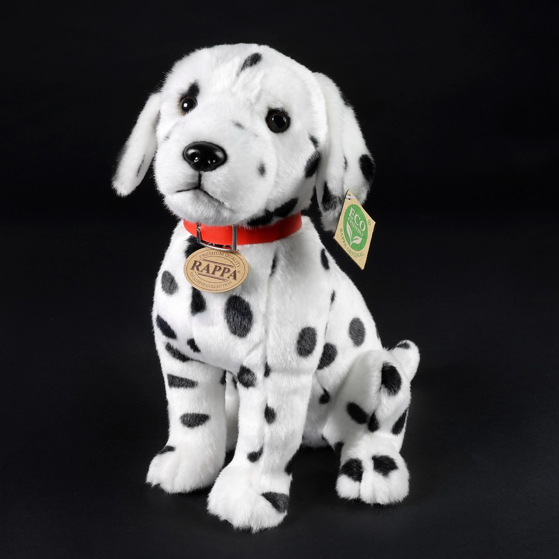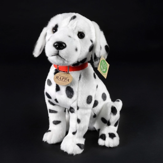 Ce dalmatien minutieusement réalisé fait partie de la collection exclusive RAPPA. Le travail manuel lui confère une expression vivante et une apparence fidèle – de la douce fourrure aux taches noires typiques jusqu’à la truffe et les yeux brodés. Un excellent compagnon pour les câlins et le jeu créatif.