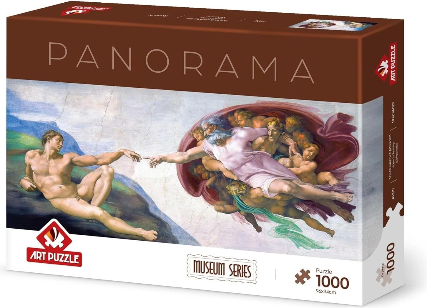 Profitez d’une expérience artistique avec ce puzzle panoramique inspiré de la fresque La Création d’Adam. Ce puzzle de 1000 pièces, aux dimensions une fois assemblé de env. 96 × 34 cm, ravira les amoureux de l’art comme les puzzleurs expérimentés. Idéal pour la relaxation, l’entraînement de la patience et comme décoration intérieure élégante.