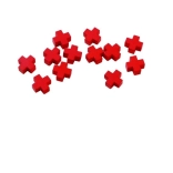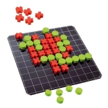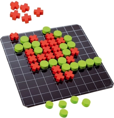 Le jeu comprend des pions en bois en forme de ronds Ø 1,5 cm et de croix 1,5 × 1,5 cm. Tous les pions sont munis d’un support magnétique, ce qui facilite leur utilisation sur la plaque.