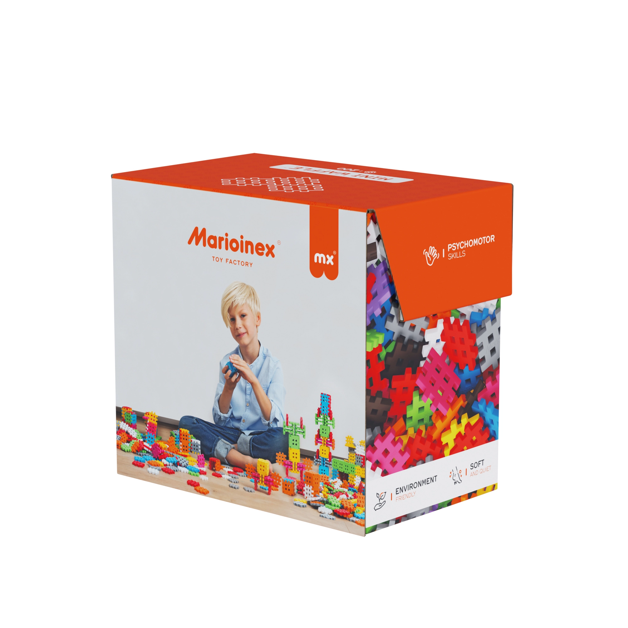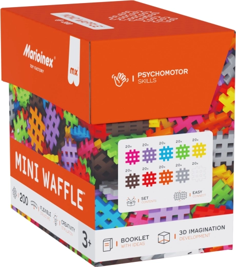 Le jeu de construction Marioinex Mini Waffle offre une grande variété de créations – des objets simples aux constructions 3D élaborées. Les pièces ont une texture souple et agréable et s’assemblent et se séparent facilement, favorisant un apprentissage en douceur, la concentration et la patience. Grâce à leur forme unique, elles sont idéales pour les petites mains et encouragent le jeu autonome.