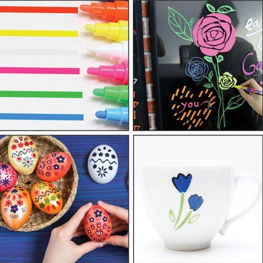 Les marqueurs écrivent de façon opaque sur divers matériaux lisses : vitrines, mugs, assiettes, décorations ou œufs de Pâques.