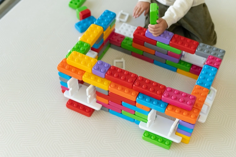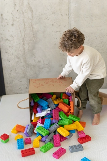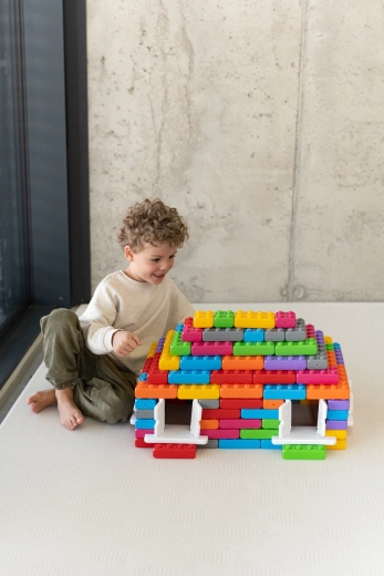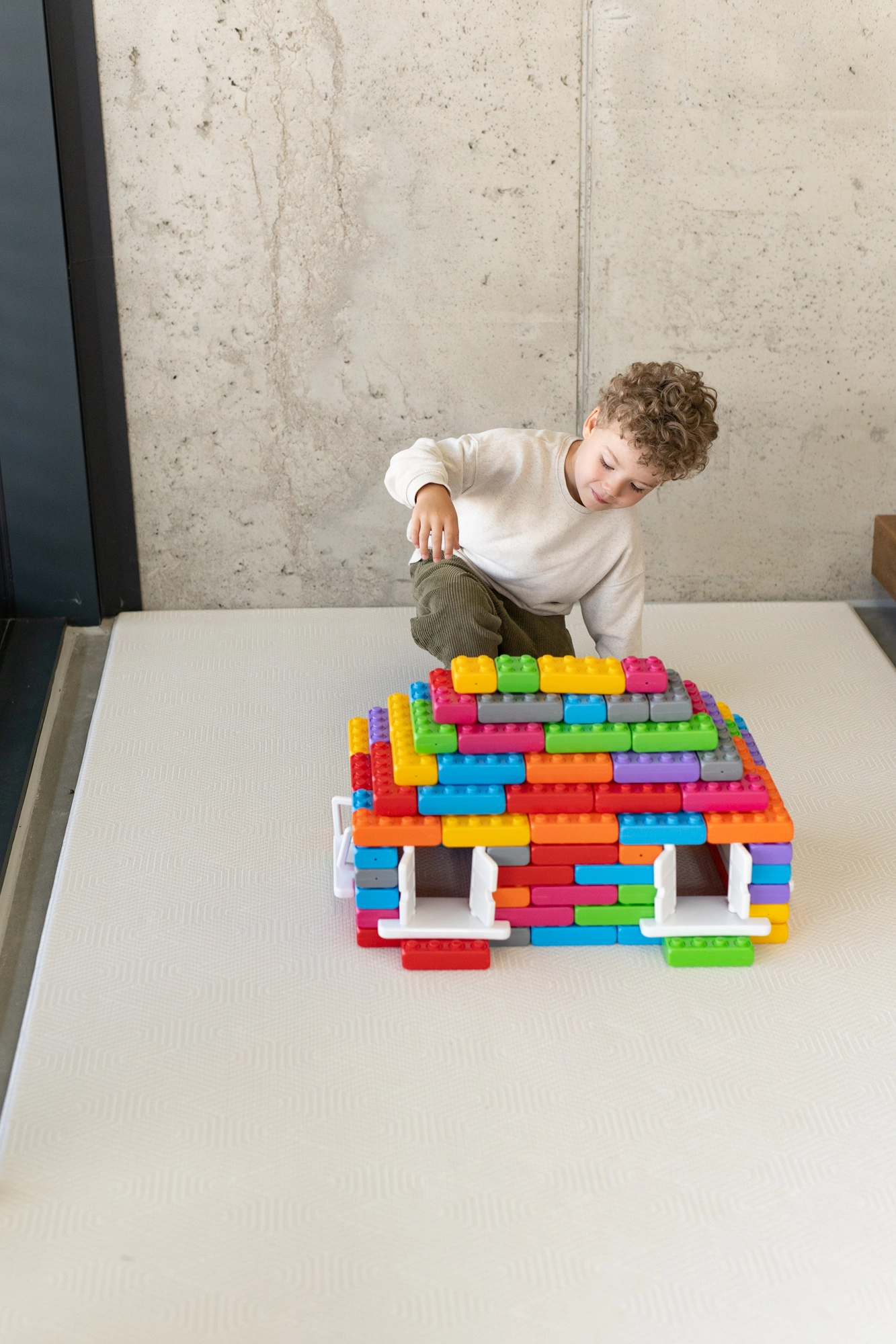 Les briques surdimensionnées sont faciles à saisir et s’emboîtent solidement. Les enfants construisent ainsi rapidement des murs, des cadres et des maisonnettes stables, sans frustration.