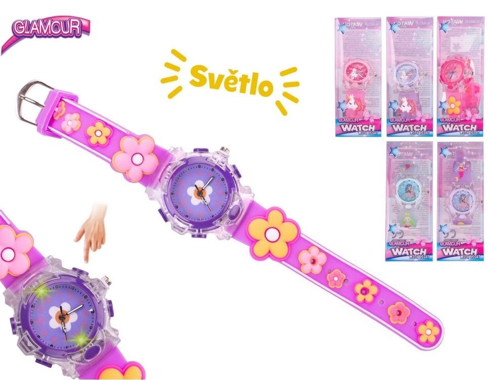 Une montre joyeuse pour filles avec un cadran classique et un effet lumineux ravira toute petite coquette qui apprend à lire l’heure. Elle est proposée avec divers motifs ludiques (licorne, sirène, fleur et variantes colorées) et est alimentée par des piles LR66 incluses dans l’emballage. Le produit est livré au hasard parmi six variantes, prix pour 1 pièce.