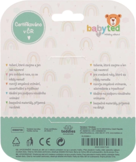 Le centre rotatif et les éléments tactiles (bulles, reliefs) incitent à presser, tourner et explorer, développant naturellement les compétences de coordination, la prise en main et la motricité fine. Le rouge contrasté avec des pois noirs et un détail vert stimule la perception visuelle et capte l’attention des enfants.