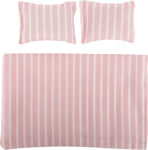 Le lit double avec couette assortie, coussins et deux petits tapis crée un espace confortable pour le repos des poupées et apporte une atmosphère authentique à la maison.