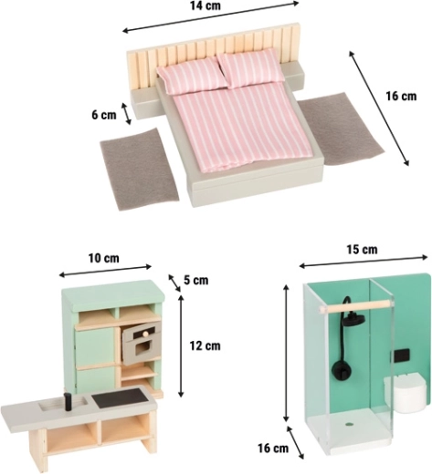 Ce set de mobilier soigneusement détaillé apporte un jeu réaliste et un beau design à l’univers des enfants. Vous y trouverez un lit double avec linge de lit textile, une salle de bain moderne avec douche type rainshower, une cuisine avec îlot et grande armoire avec four et réfrigérateur, un coin repas avec table et bancs, ainsi qu’un salon chaleureux avec canapé, lampe et table basse.