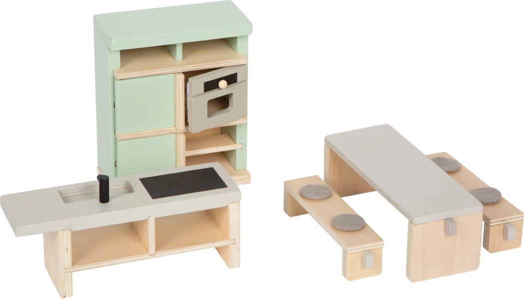 La cuisine avec îlot, évier et plaque de cuisson est complétée par une grande armoire avec réfrigérateur et four. La salle à manger comprend une table et des bancs avec assises confortables – idéale pour des jeux réalistes de cuisine et de repas.