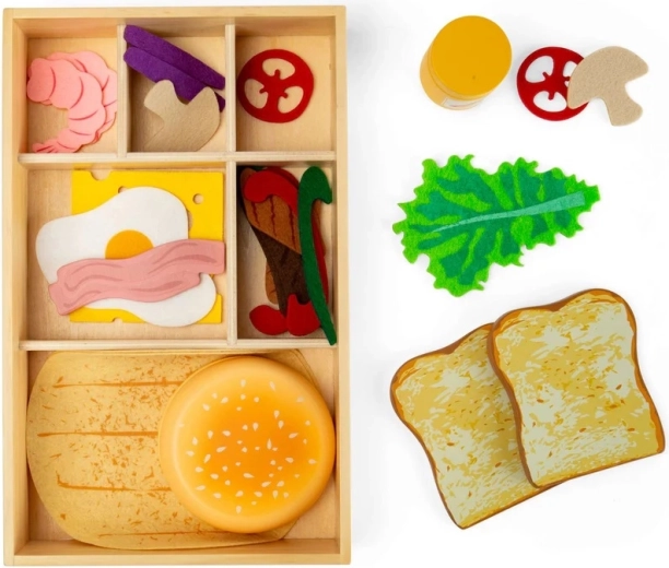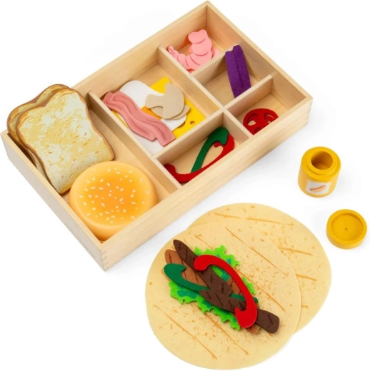 Une large palette d’ingrédients en bois et en feutrine permet aux enfants de composer des sandwiches, burgers et wraps exactement selon leurs envies, tout en développant imagination et motricité fine.