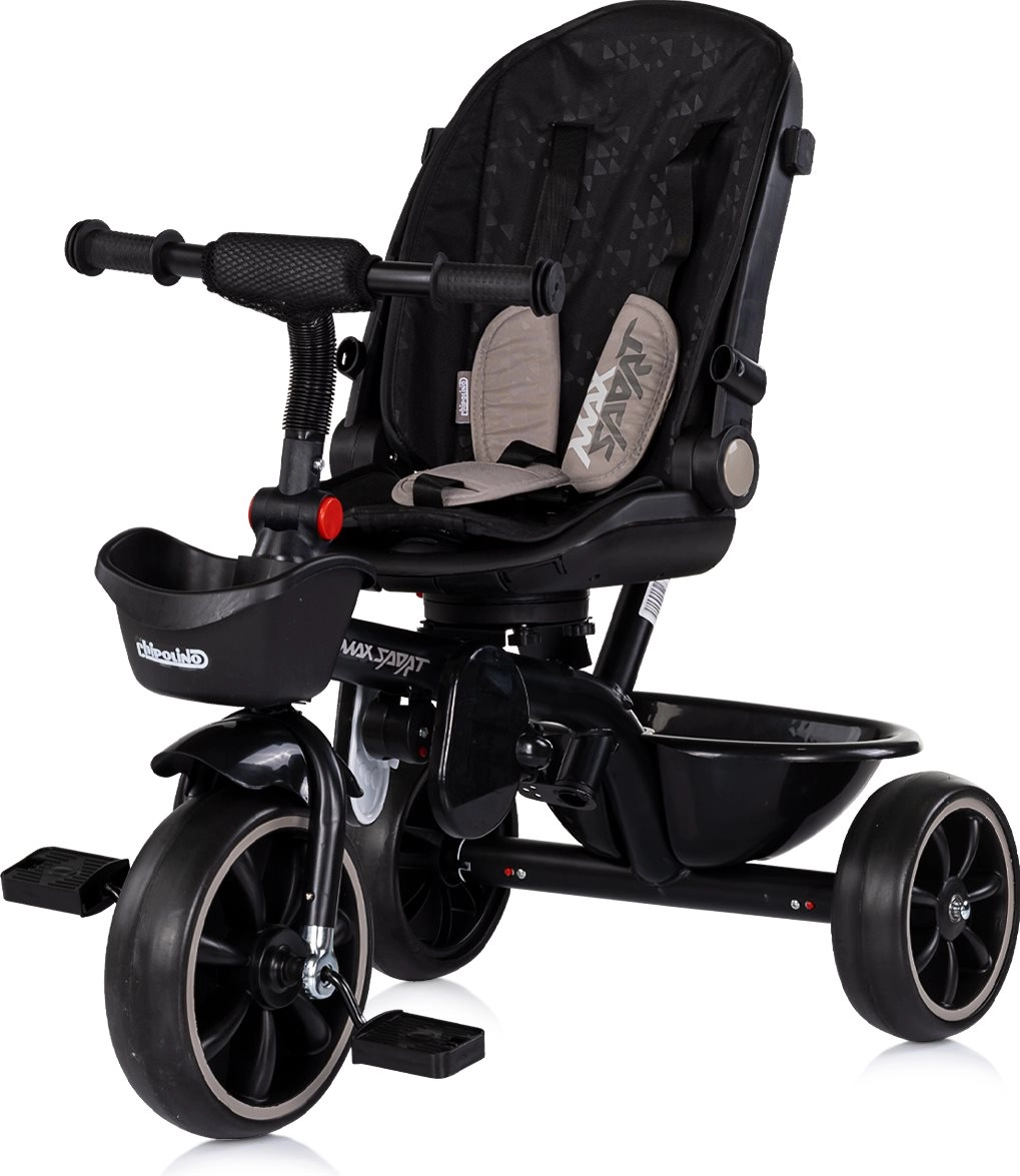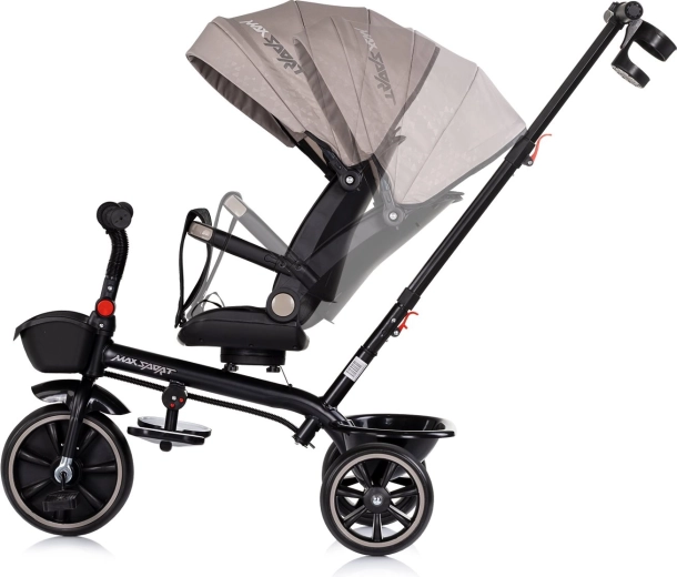 Pour un confort maximal, le tricycle est équipé d’un doux rembourrage textile, d’une ceinture de sécurité, de repose-pieds rabattables et de paniers spacieux à l’avant et à l’arrière. La poignée parentale réglable sur deux hauteurs permet un guidage sûr et un contrôle précis de la direction. L’auvent pliant avec pare-soleil protège du soleil et le porte-gobelet peut être fixé en deux positions.