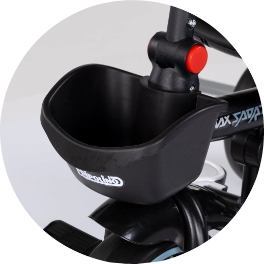 La poignée parentale à hauteur réglable facilite la conduite et l’assistance à la direction. Quand l’enfant grandit, il suffit de retirer l’auvent, la poignée et le pare-chocs de protection pour transformer le tricycle en véhicule autonome. Des paniers pratiques à l’avant et à l’arrière ainsi qu’un porte-bouteille gardent tout le nécessaire à portée de main.