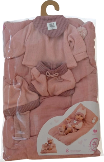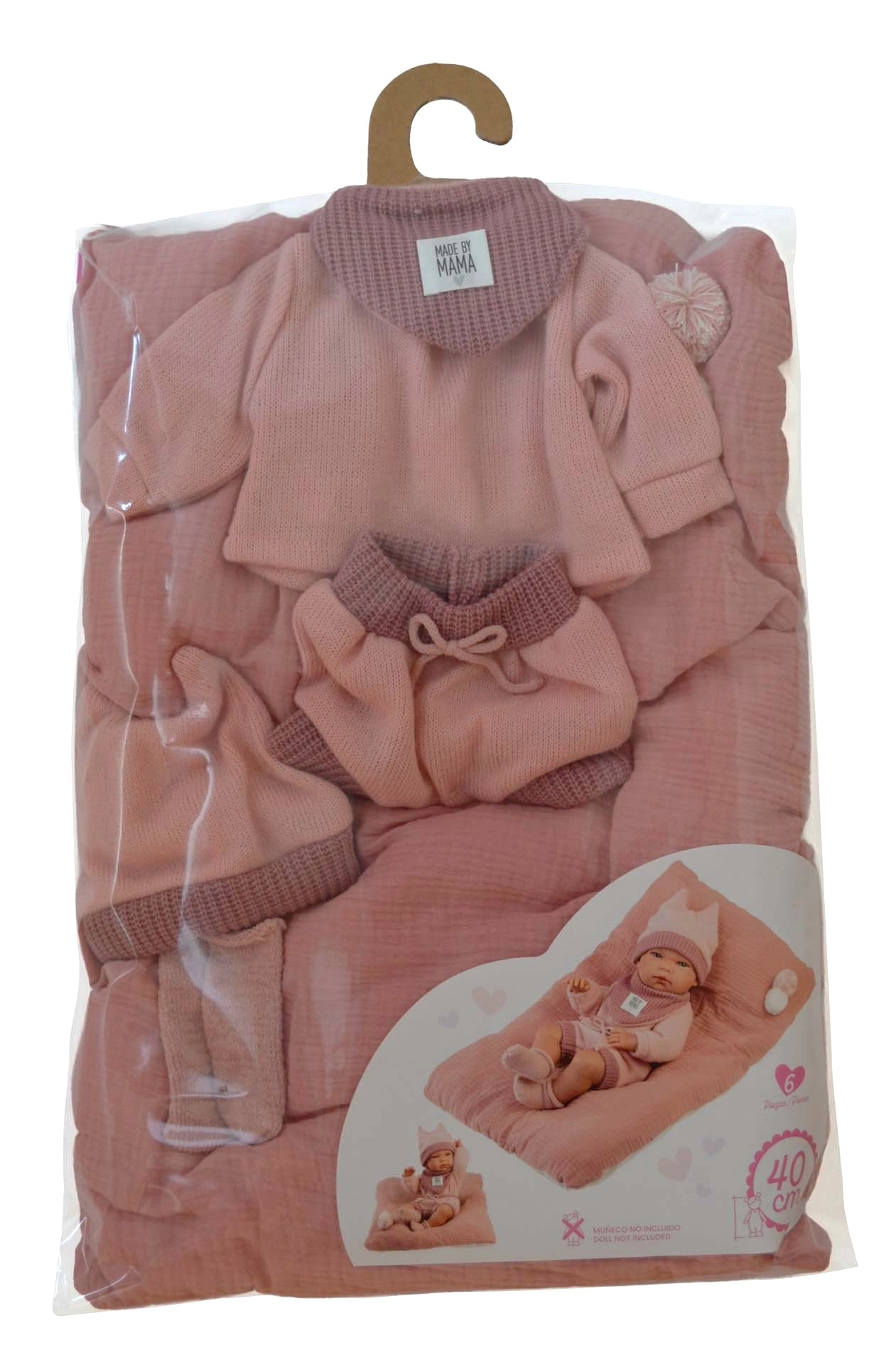 Quatre pièces de vêtements assorties complétées par un coussin/tapis décoratif qui rend le lit et l’aire de jeu de la poupée encore plus douillets.