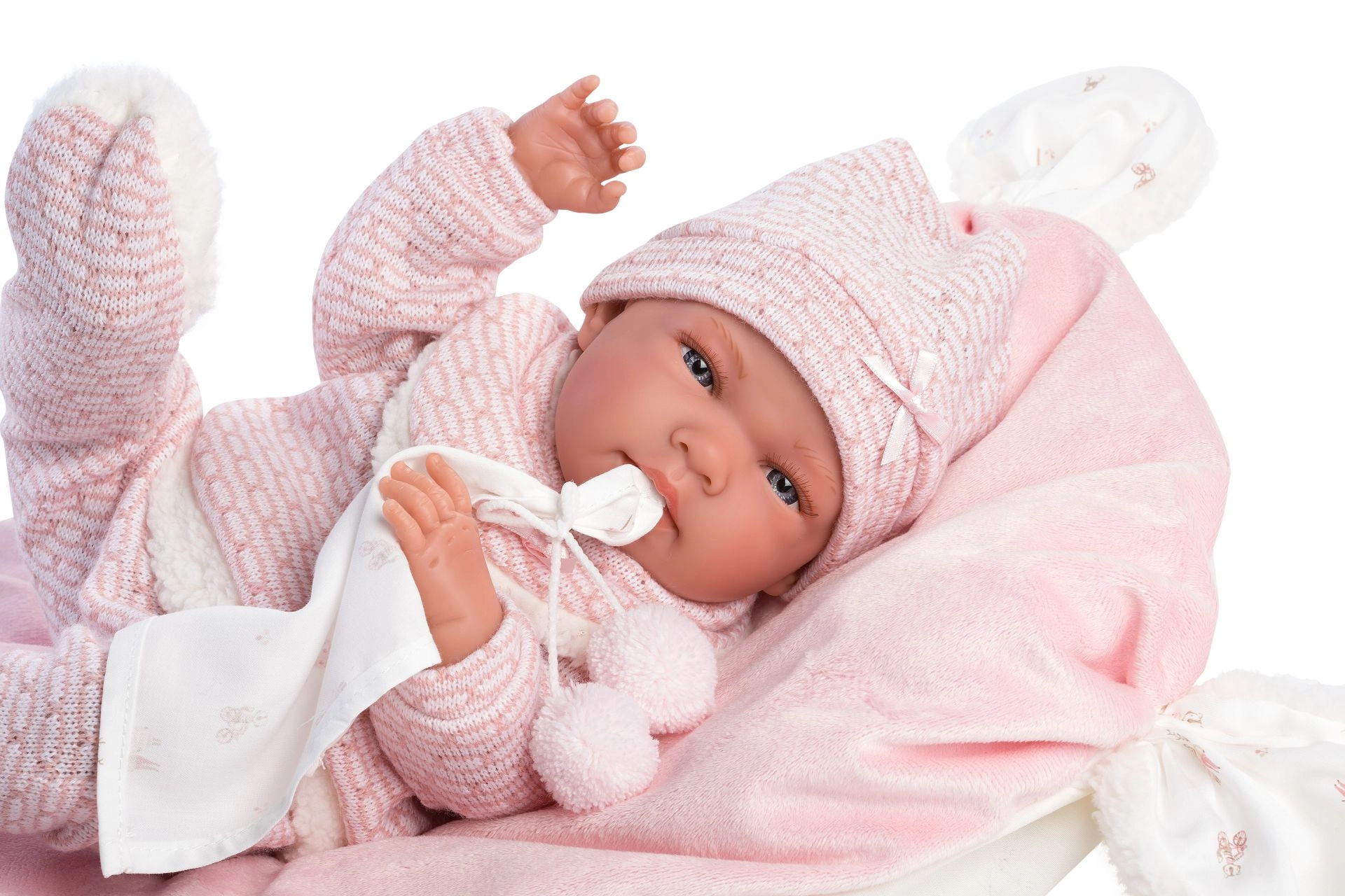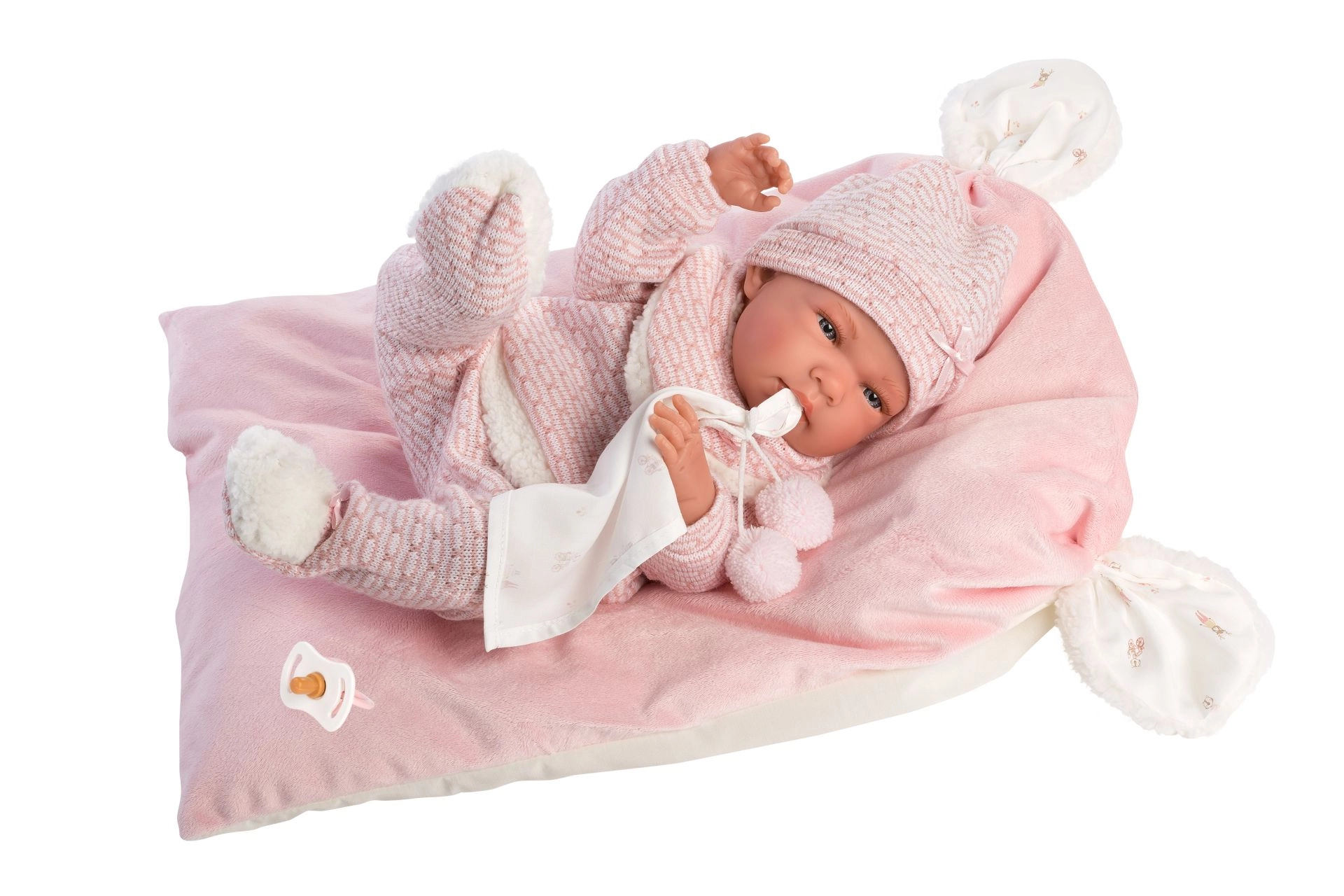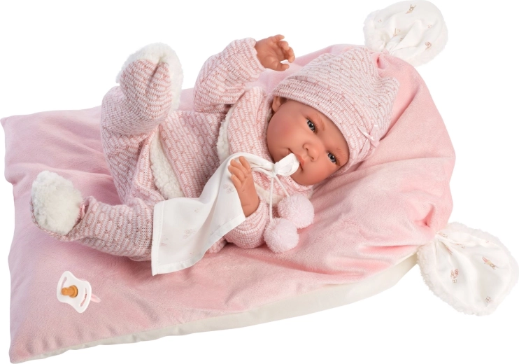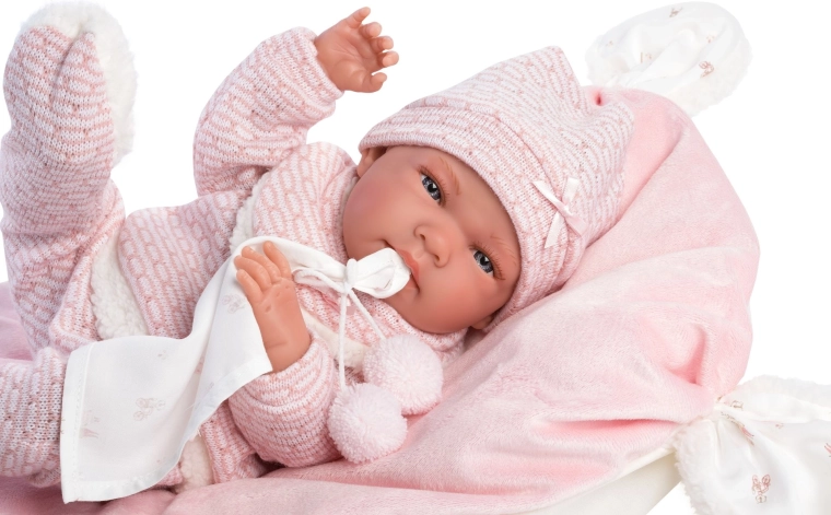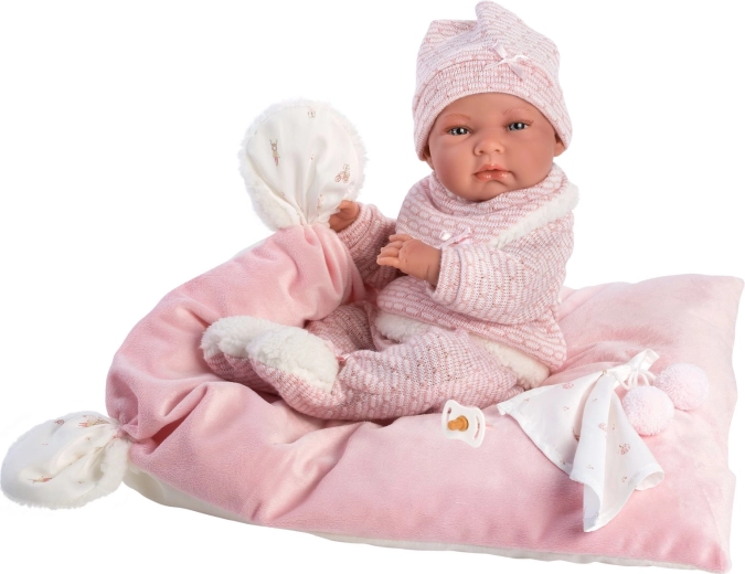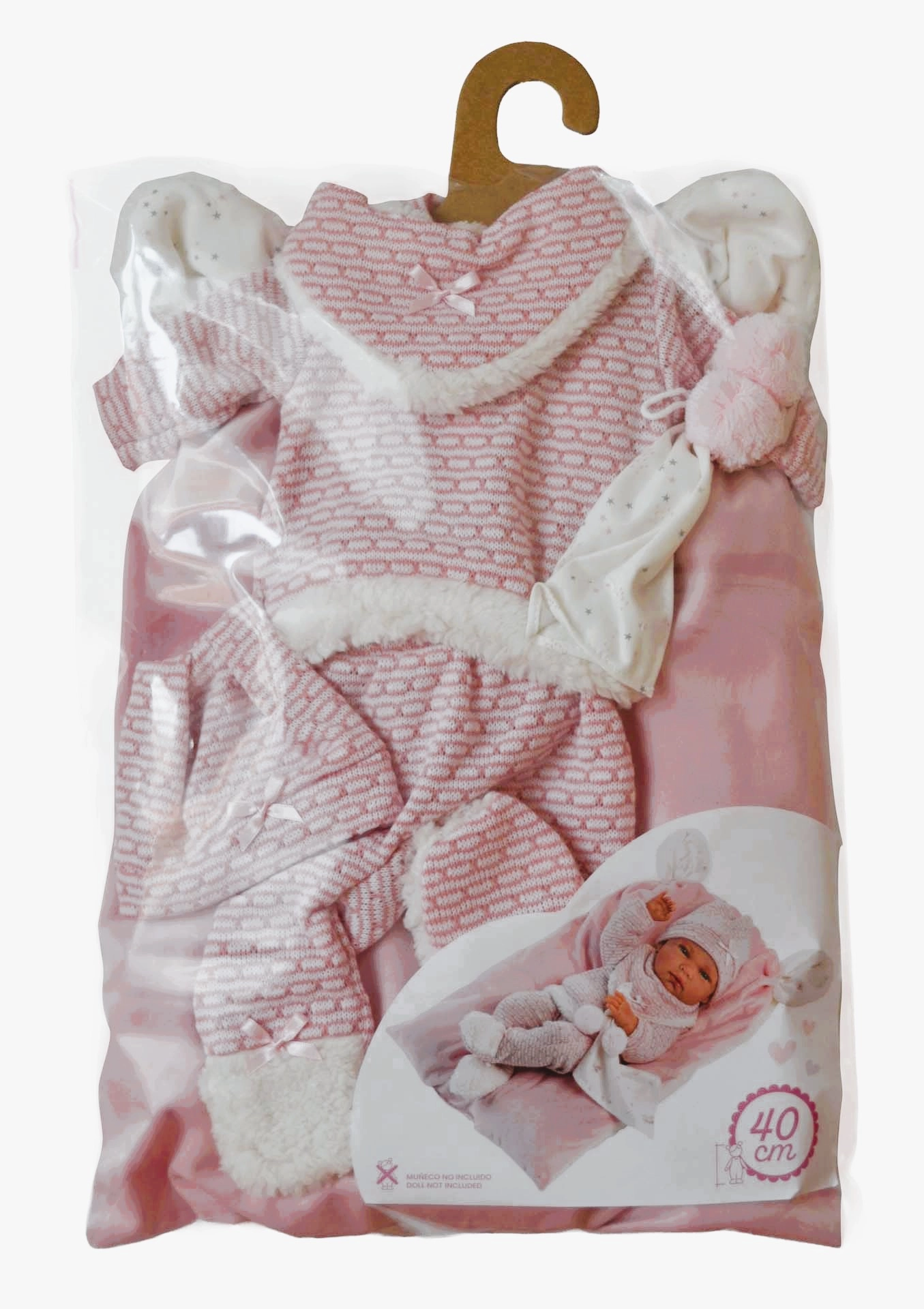 Un set de vêtements stylé et chaud pour poupée, qui apporte tout ce dont les petits soigneurs ont besoin : des pièces tricotées douces avec bordure pelucheuse, un adorable doudou à pompons et un coussin décoratif faisant aussi office de tapis confortable. Tout est conçu pour les poupées Llorens NEW BORN de 40–42 cm.