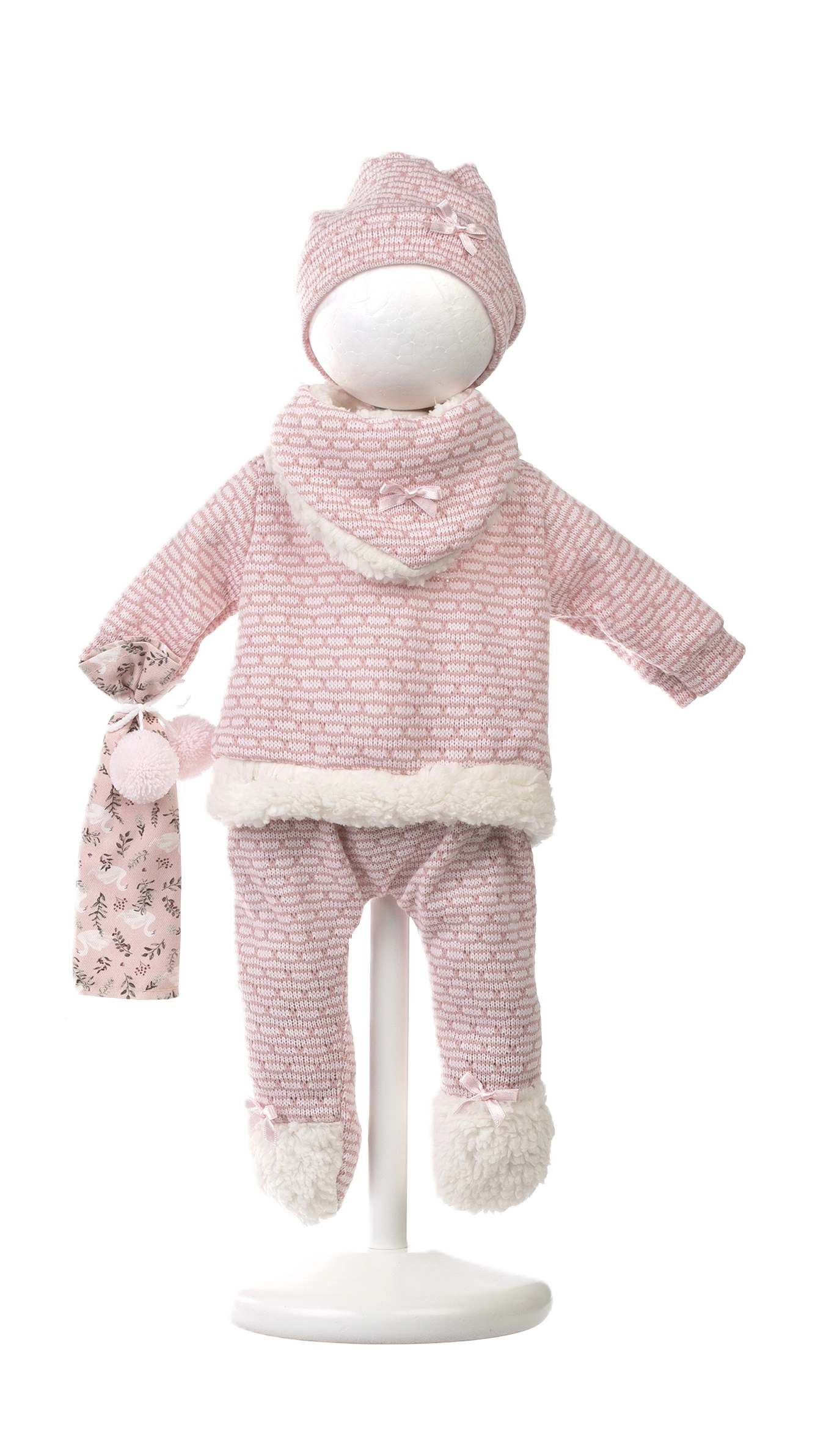 Le set comprend un haut chaud, un pantalon, un bonnet et des chaussons avec bords moelleux – idéal pour habiller la poupée en hiver et jouer confortablement.