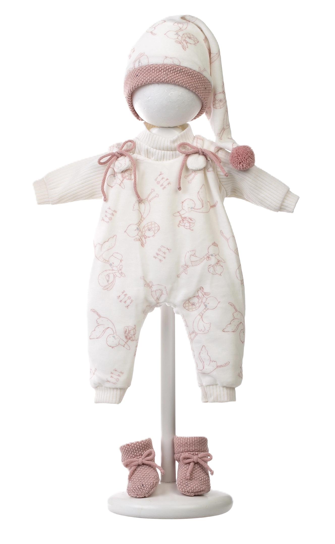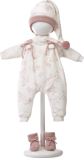 Le set comprend un body/combinaison à motif adorable, un bonnet long et des chaussons tricotés dans des teintes douces – le tout en textiles agréables pour un habillage facile et le confort de la poupée.