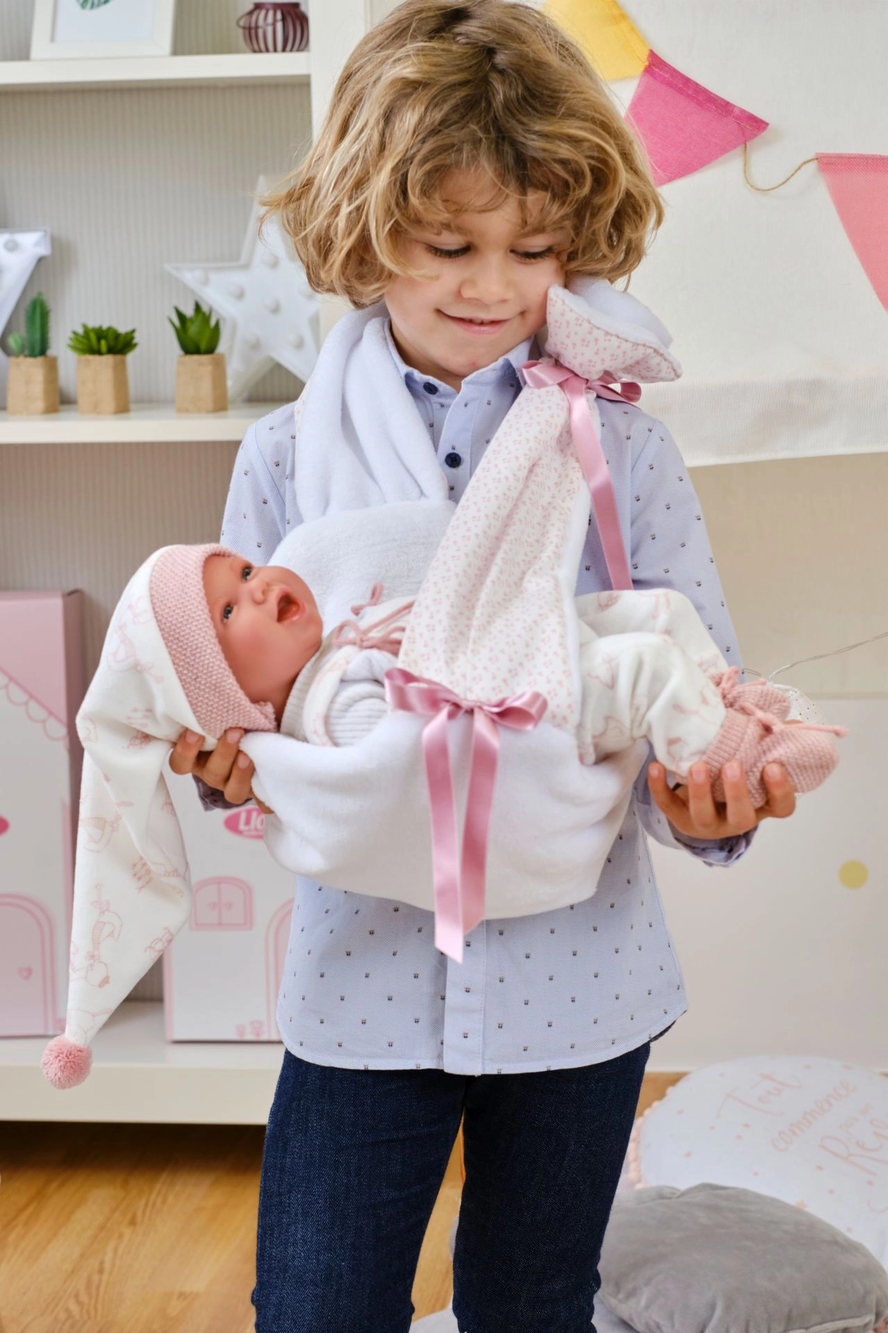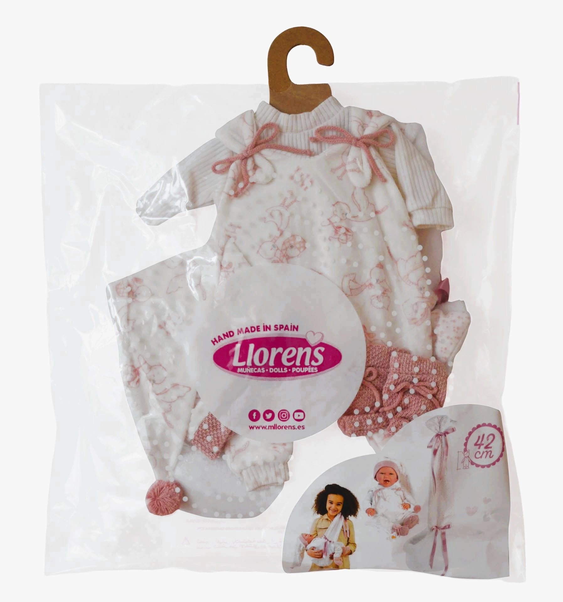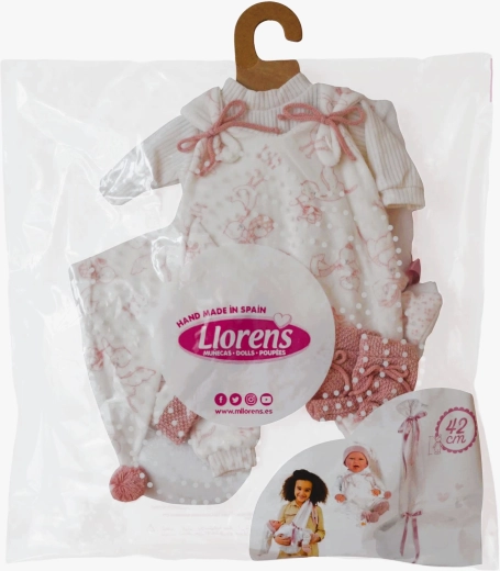 Le set est fabriqué à la main en Espagne et conçu pour les poupées Llorens NEW BORN de 40–42 cm. Grâce à une confection de qualité et à des détails — tels que petits nœuds, bords côtes ou chaussons tricotés — les tenues paraissent réalistes et élégantes. Parfait pour développer la motricité fine, l’empathie et l’imagination des enfants.