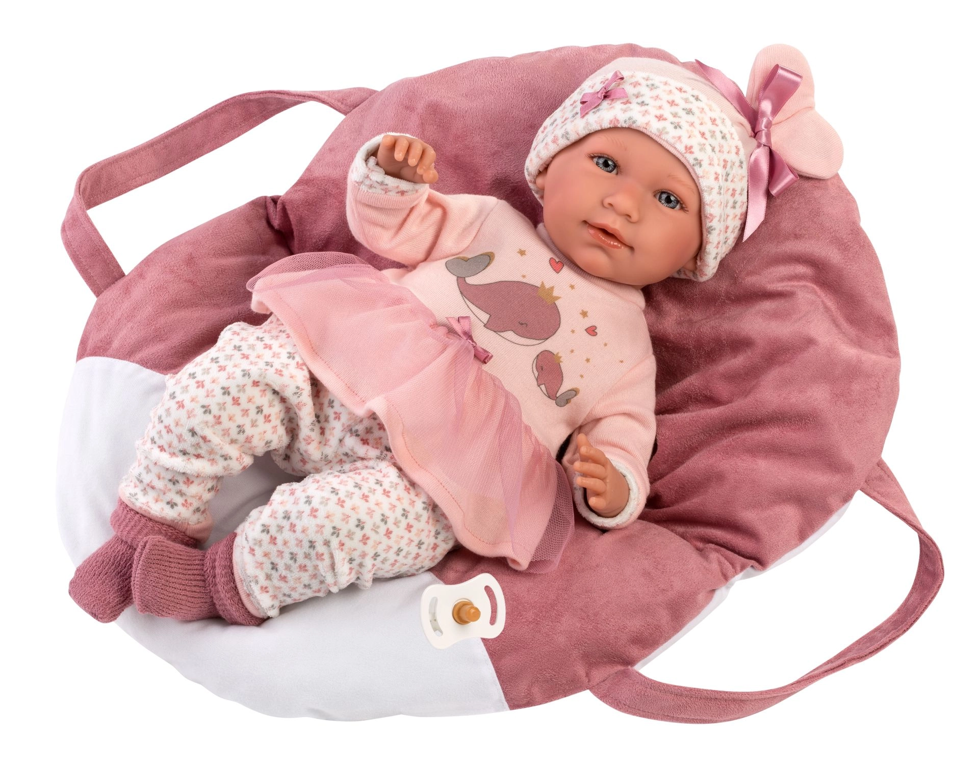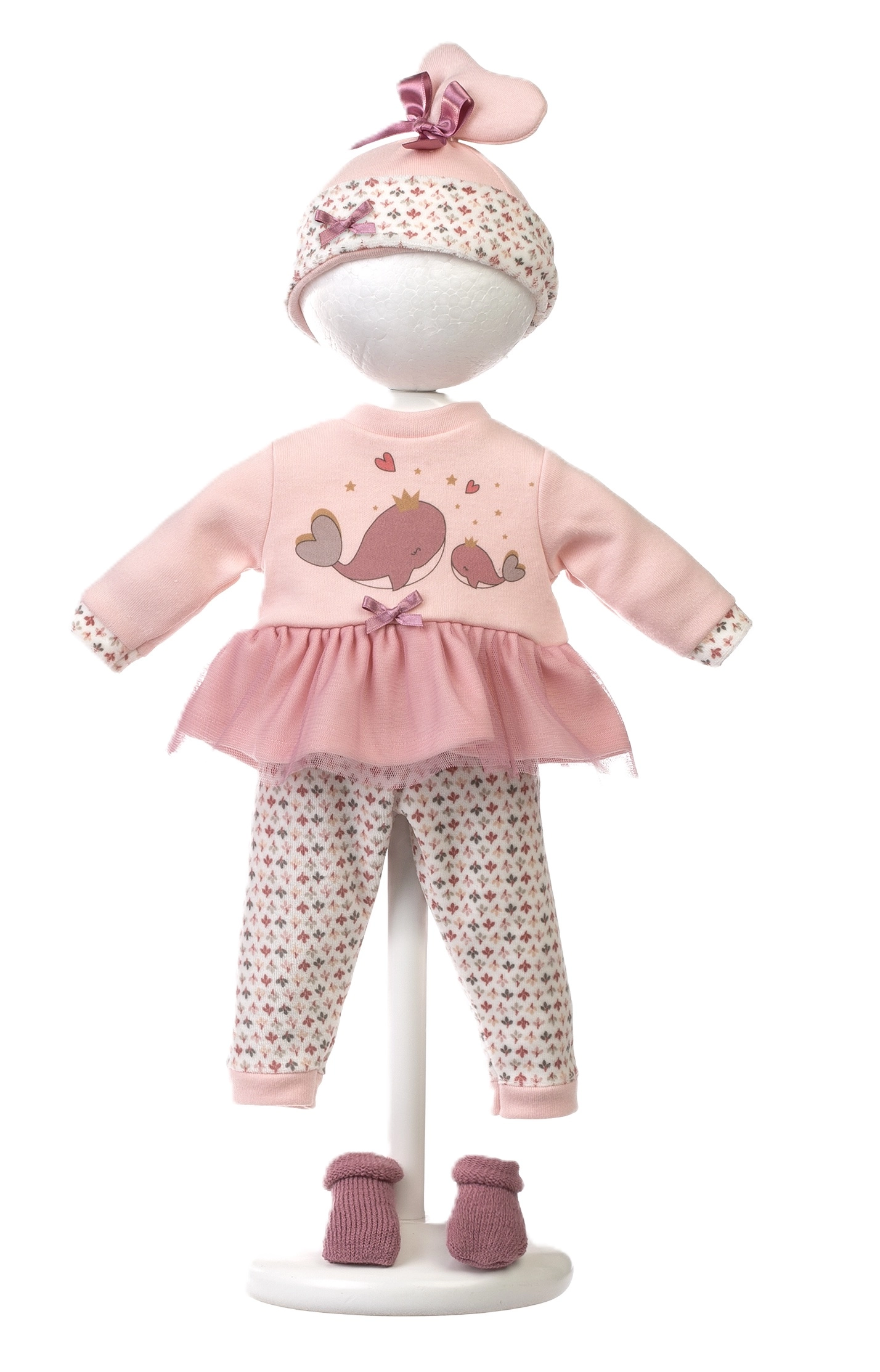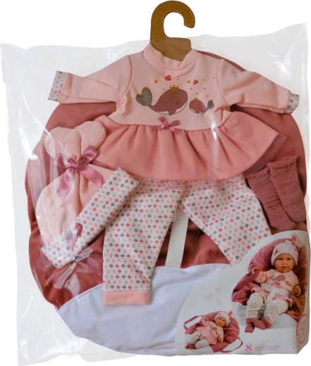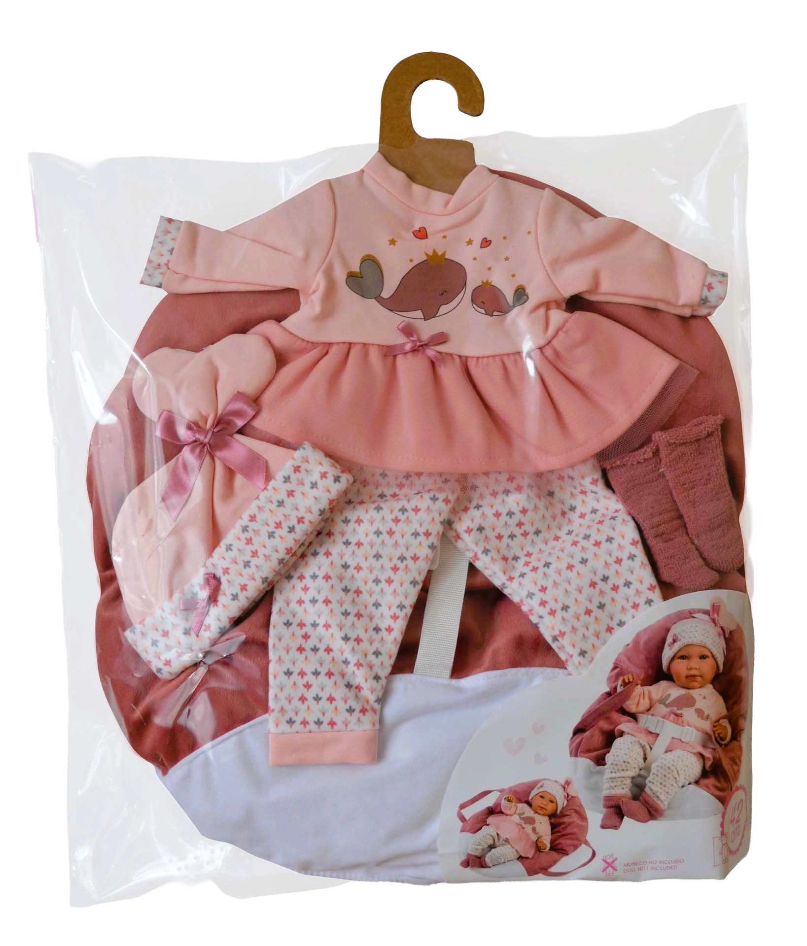 Habillez la poupée de la tête aux pieds – un haut/robe rose à motif baleines, des leggings, un bonnet et des chaussons, complétés par un porte-bébé à main moelleux.
