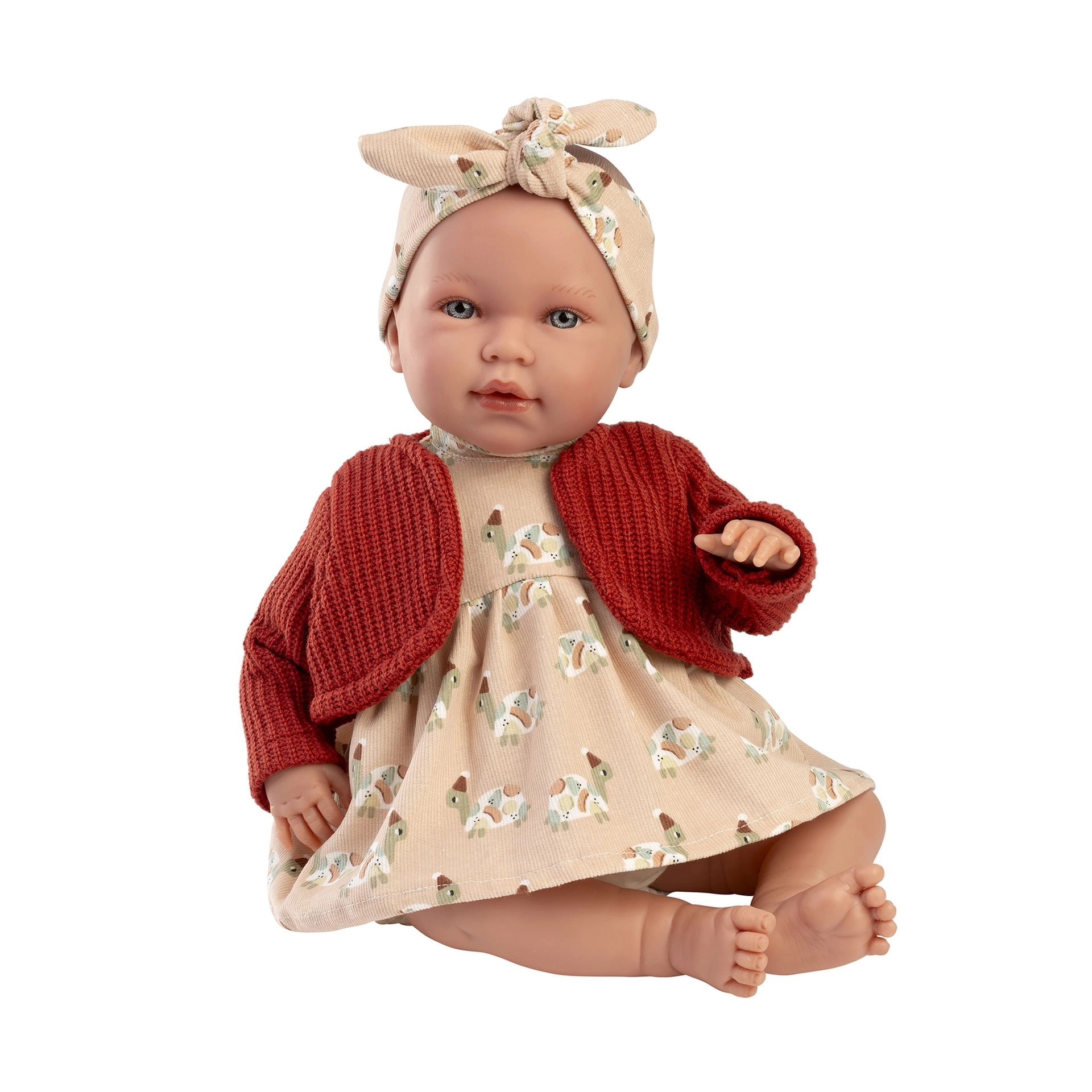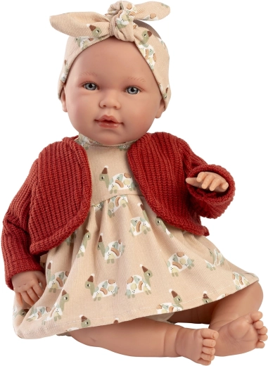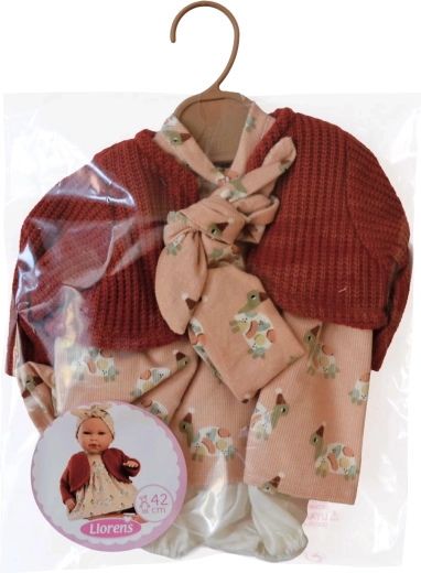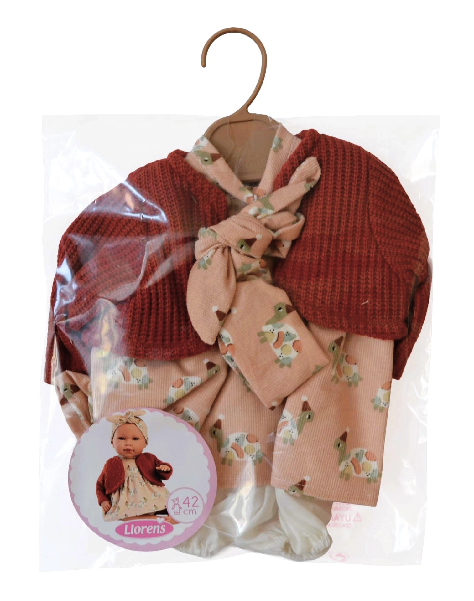 Tenue stylée en 4 pièces pour poupée New Born de la marque Llorens, taille 40–42 cm. Fabriquée à la main en Espagne avec des matériaux de qualité, livrée dans un emballage pratique avec cintre. Idéale pour développer l’imagination et le sens des soins lors du jeu. Recommandé à partir de 3 ans.