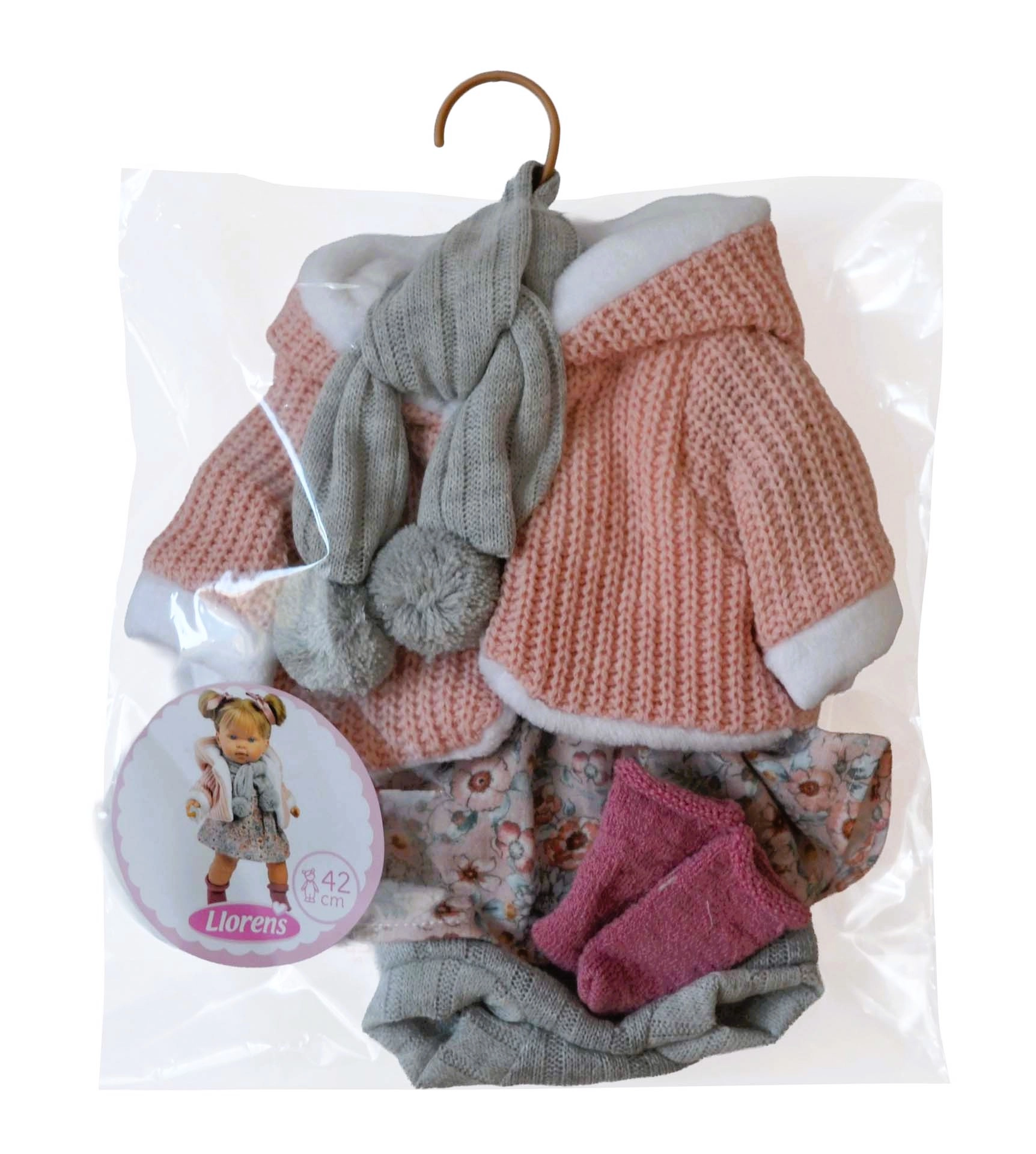 Un ensemble stylé de 5 pièces pour poupées de 42 cm qui offre une parfaite combinaison de confort et d’élégance. Il comprend une veste à capuche tricotée rose, une écharpe grise à pompons, une jupe à fleurs, un short gris et des chaussettes roses. L’ensemble est fabriqué à la main en Espagne, soigneusement conçu et idéal pour développer l’imagination et les compétences lors de l’habillage des poupées.