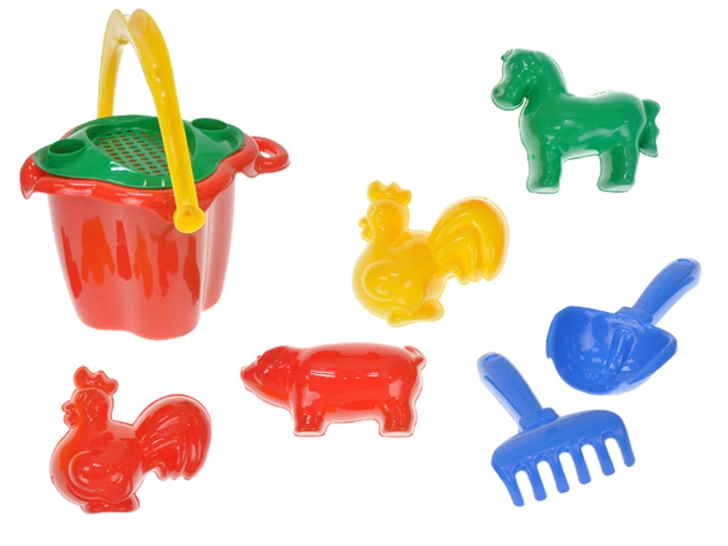 Seau avec tamis, pelle, râteau et moules animaux – tout ce dont les enfants ont besoin pour faire des gâteaux de sable et construire des châteaux.
