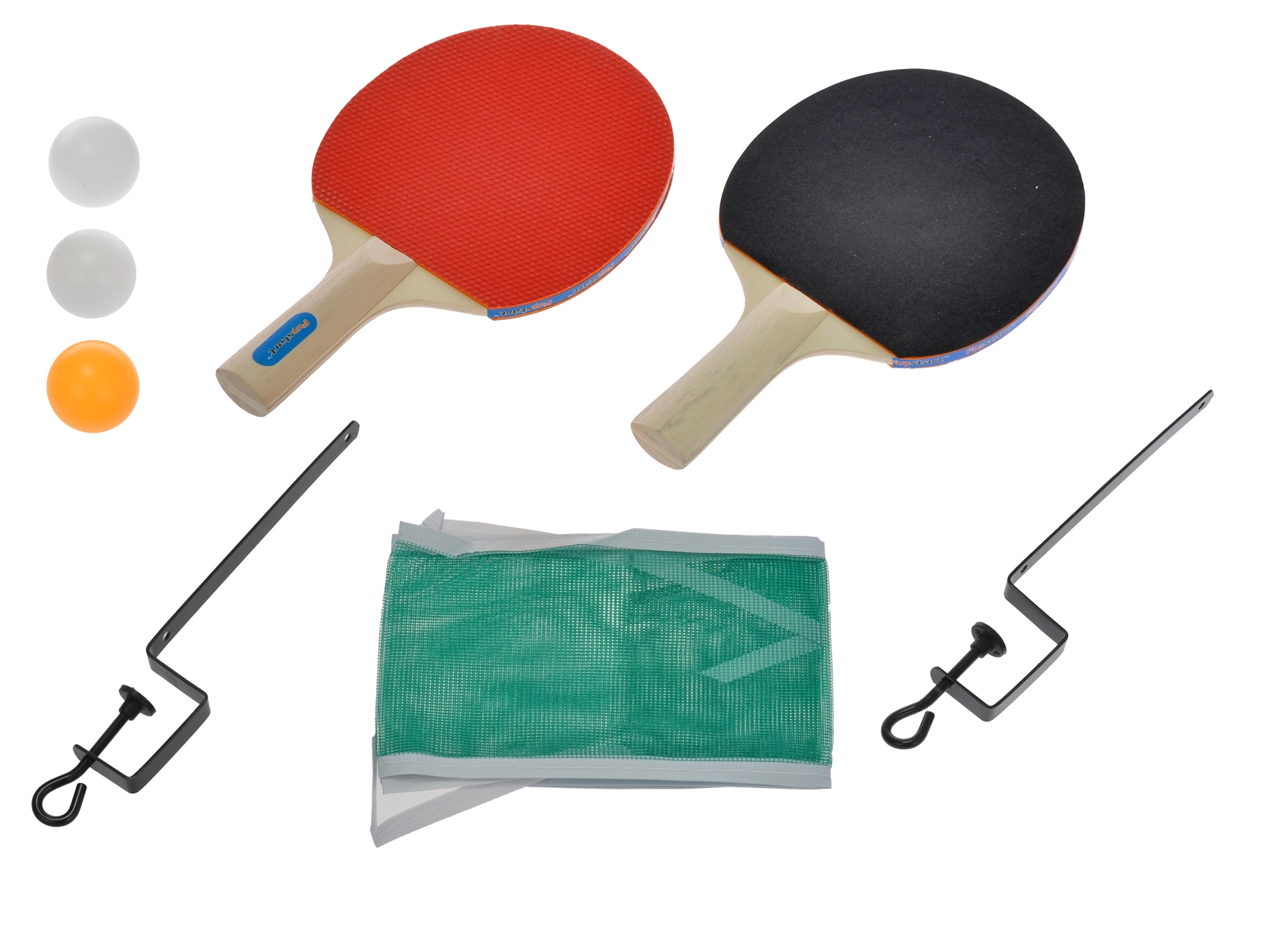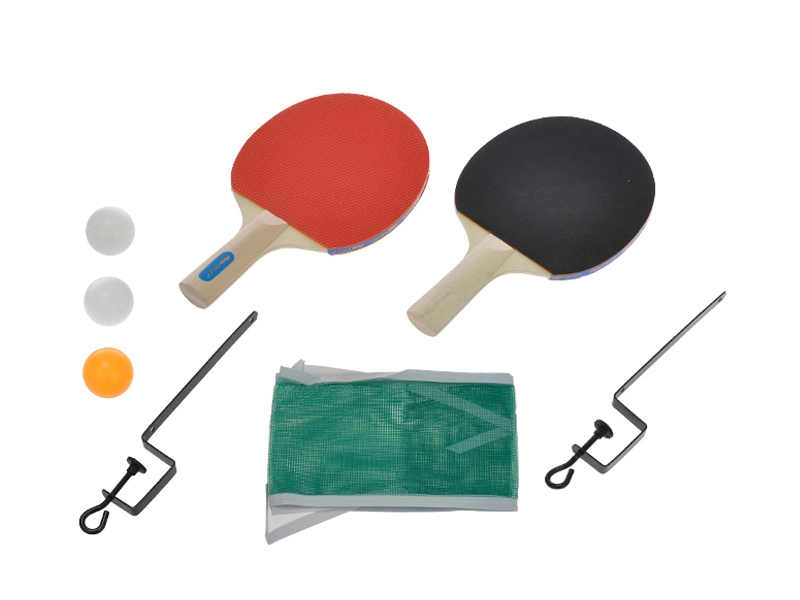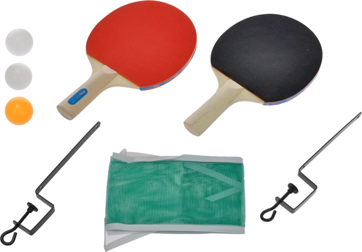 Deux raquettes, trois balles et un filet avec pinces métalliques – déballez et jouez en un instant.