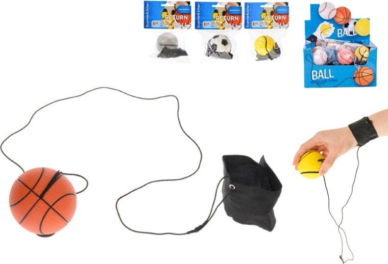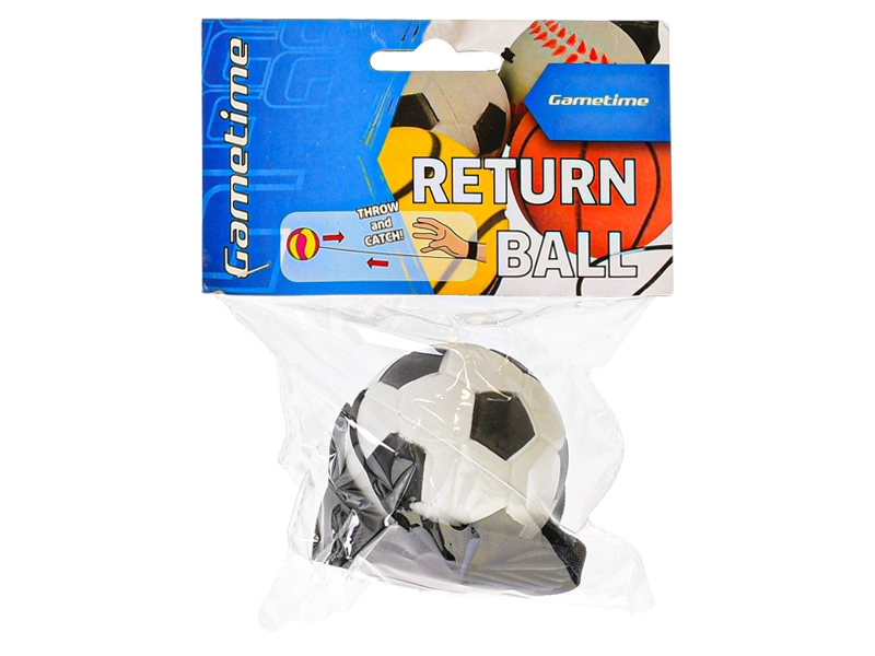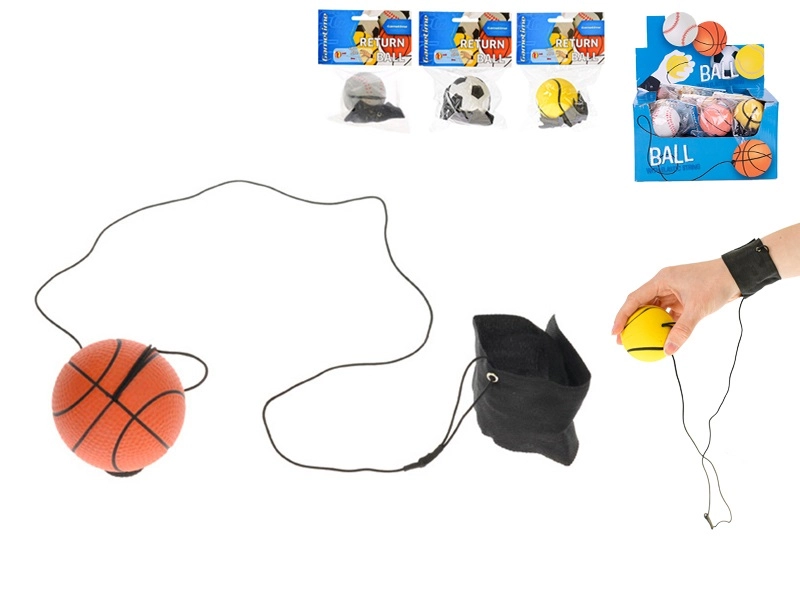 Jouet amusant pour enfants et adultes : balle de retour GAMETIME de 60 mm de diamètre, fixée à un cordon élastique avec un bracelet de poignet, elle revient toujours après le lancer. Idéale pour entraîner la coordination, les réflexes et pour un jeu en solo en toute sécurité sans perdre la balle. Disponible en versions tennis, football, basket-ball et base-ball. Convient à partir de 6 ans.