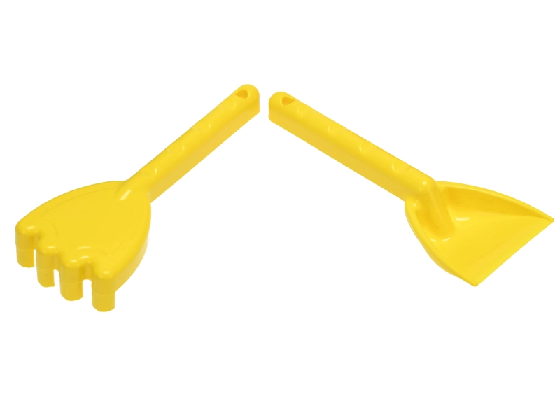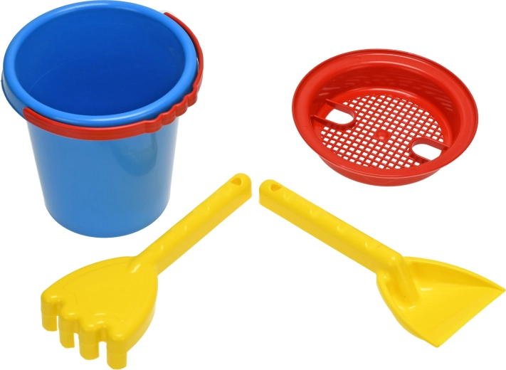 Le seau, le tamis, la pelle et le râteau offrent un équipement complet pour construire gâteaux de sable, châteaux et barrages dans le bac à sable ou sur la plage.