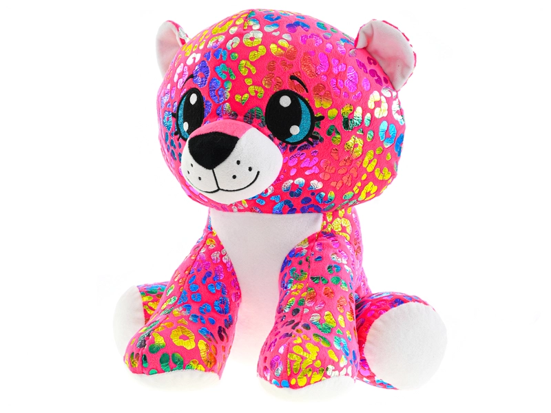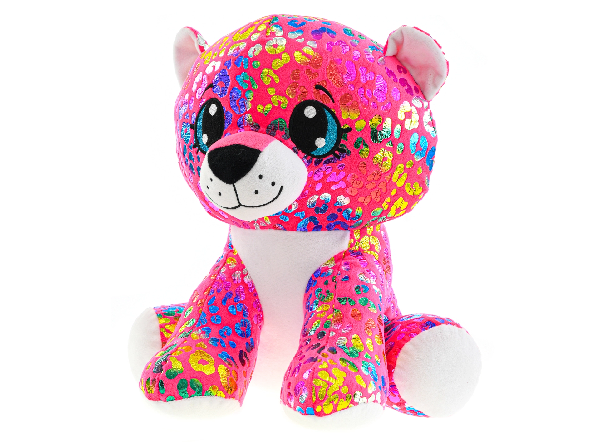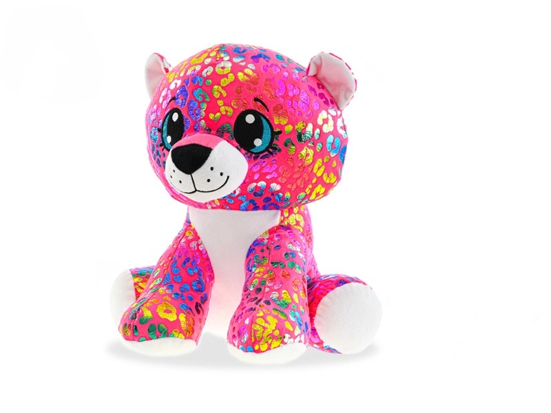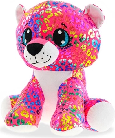 Ce léopard en peluche coloré est le compagnon parfait pour les enfants – il est doux et moelleux et, grâce à sa forme assise, se tient facilement et se pose joliment sur une étagère. Ses grands yeux brodés, son motif scintillant et ses pattes blanches contrastées lui donnent une expression unique que les enfants adoreront immédiatement.