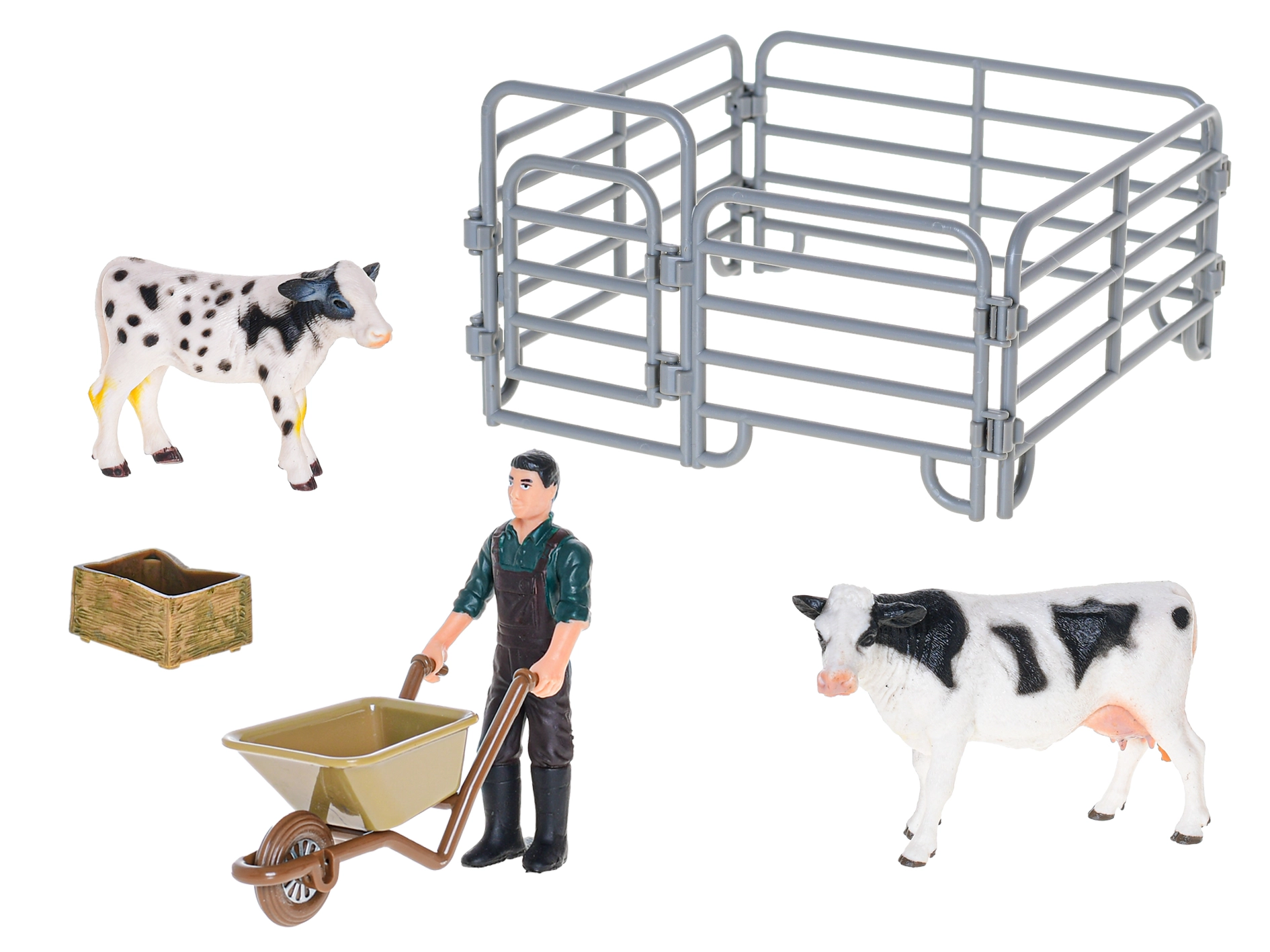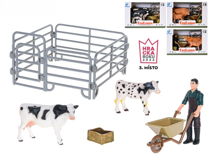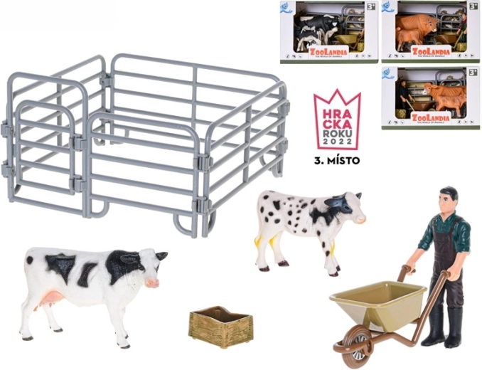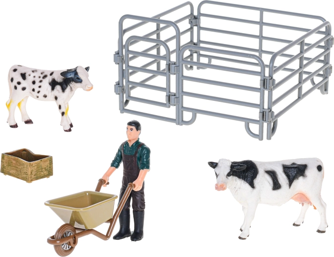 - figurines (vache et veau ou taureau), accessoires thématiques (p. ex. fourche, débroussailleuse, balai – selon la variante)