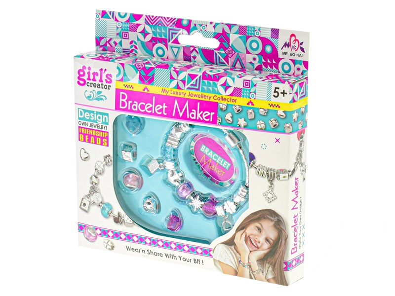 Le set créatif comprend un bracelet en plastique résistant et différentes breloques et perles à large trou pour un enfilage confortable. Les enfants peuvent composer en un instant leur propre combinaison colorée et adapter l’apparence du bijou à leur tenue ou à leur humeur.