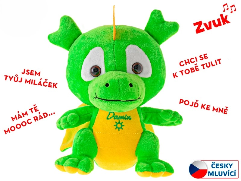 Le petit dragon en peluche Damin est un ami tout doux qui fera plaisir à chaque enfant. Une simple pression sur la main/patte déclenche des phrases tchèques qui renforcent les liens affectifs et le sentiment de sécurité. Grâce à sa taille de 19 cm, il est léger pour les petites mains et convient aux voyages comme au lit.