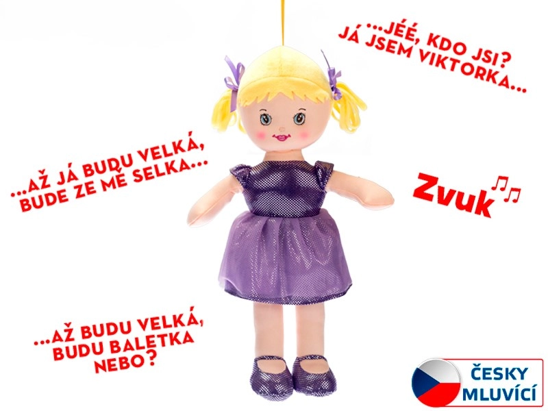 La poupée Viktorka est une amie en tissu toute douce qui accompagne les enfants dans leurs premiers pas dans le monde du jeu. Elle séduit par sa robe et ses petits souliers violets, et en plus, lorsqu’on appuie, elle parle et chante en tchèque : « Quand je serai grande, je serai fermière… ». Un excellent choix pour développer les sens, la motricité fine et l’éveil émotionnel.