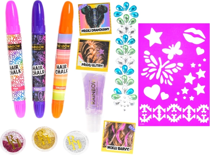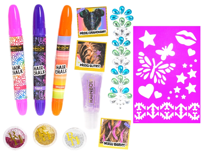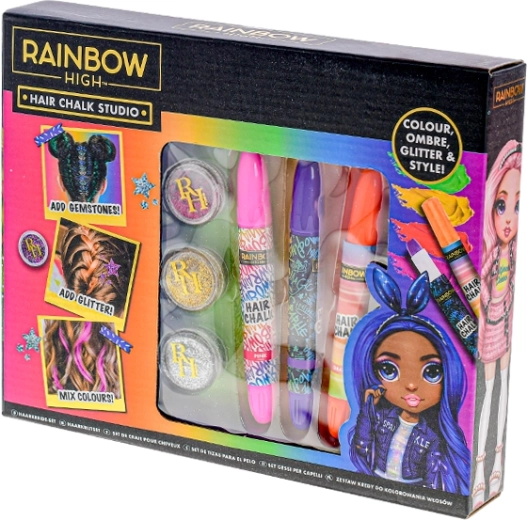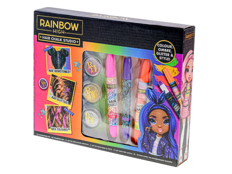 Découvrez l’univers RAINBOW HIGH et créez un look unique en un rien de temps. Le set est conçu pour une décoration des cheveux sûre et temporaire, et stimule la créativité ainsi que l’imagination. Grâce à une application simple, même les débutants réussiront des coiffures spectaculaires.