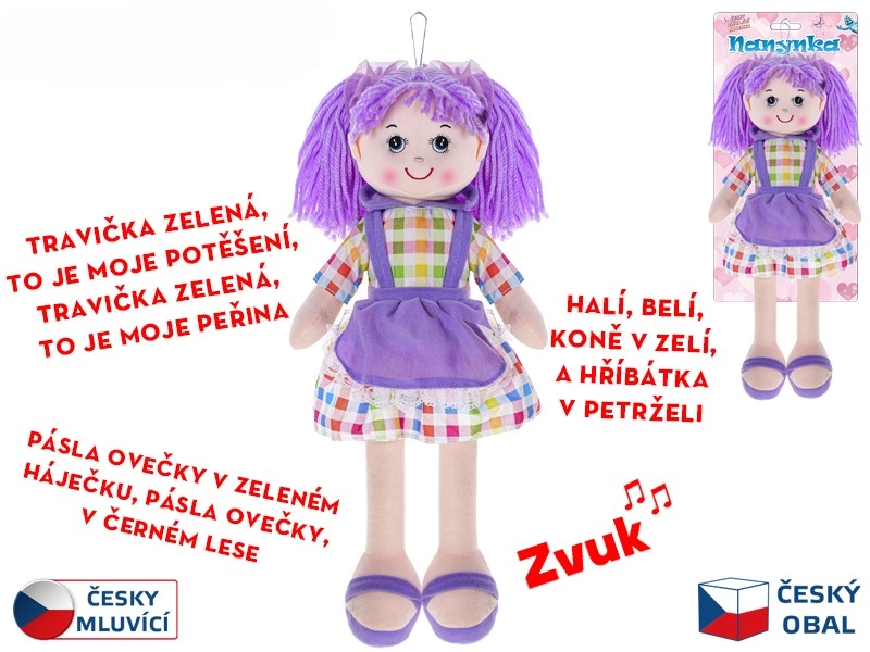 La ravissante poupée Nanynka au corps souple fera le bonheur de chaque petite princesse. Elle mesure 50 cm, porte une jolie robe violette et, grâce à ses fonctions, parle et chante en tchèque. Sa conception souple assure un jeu sûr et confortable dès la naissance. L’alimentation se fait avec 3× piles bouton LR44 incluses.