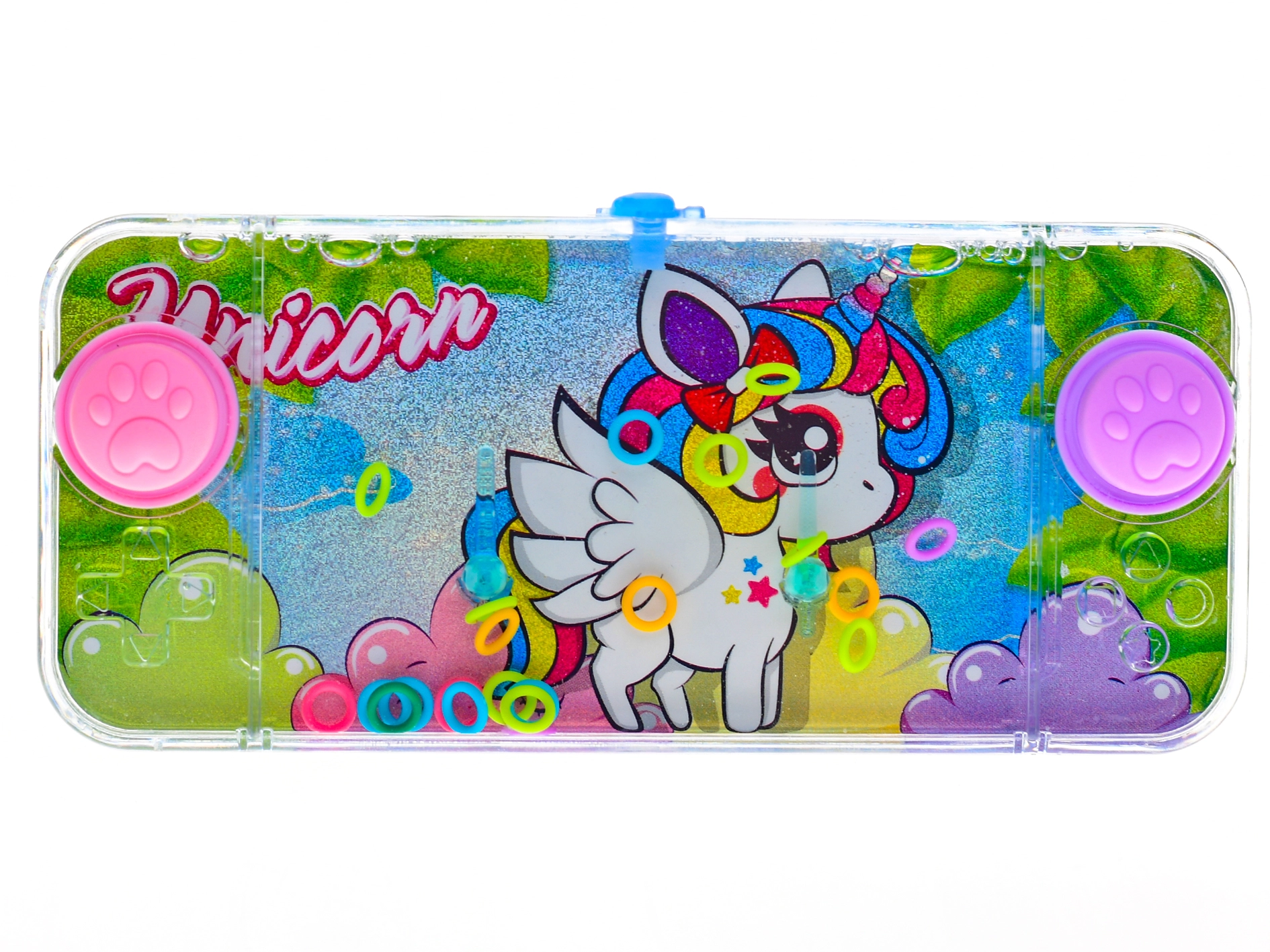 Un jeu d’eau amusant sur le thème de la licorne ravira chaque enfant. Grâce à ses dimensions compactes de 15,5 × 7 × 1 cm, il est idéal à la maison comme en voyage. En appuyant sur les boutons, vous mettez l’eau en mouvement et essayez de placer les anneaux sur les piquets – simple, addictif et sans piles. Le jeu développe la patience et la motricité fine, est sûr dès 3 ans et disponible en 4 adorables designs.