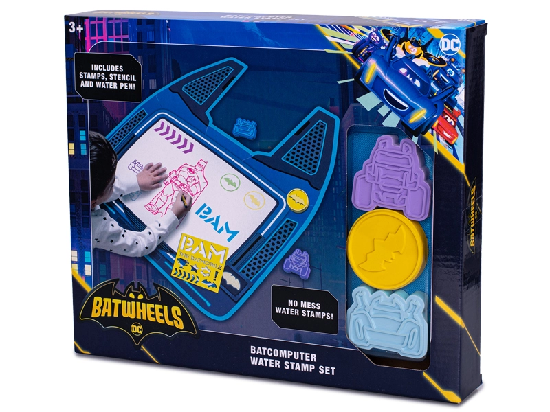 Un set créatif de tampons à l’eau inspiré par les héros de DC Comics offre aux enfants un amusement propre et sûr, sans désordre. À l’aide d’un stylo à eau spécial et de tampons, ils créent des images sur un tapis en forme de Batcomputer – il suffit d’eau. Sans encre ni peinture, facile à utiliser et favorise la créativité et la motricité fine, ce set est un cadeau idéal pour les jeunes fans de BATMAN et BATWHEELS.
