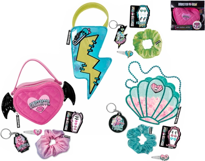 Découvrez la magie de la série MONSTER HIGH avec ce mini sac à main adorable qui fera plaisir à toute petite coquette. Trois motifs originaux – coquillage, éclair et cœur – font référence aux personnages préférés et à leur style unique. Chaque version est accompagnée de petits accessoires tendance assortis à la personnalité du personnage.