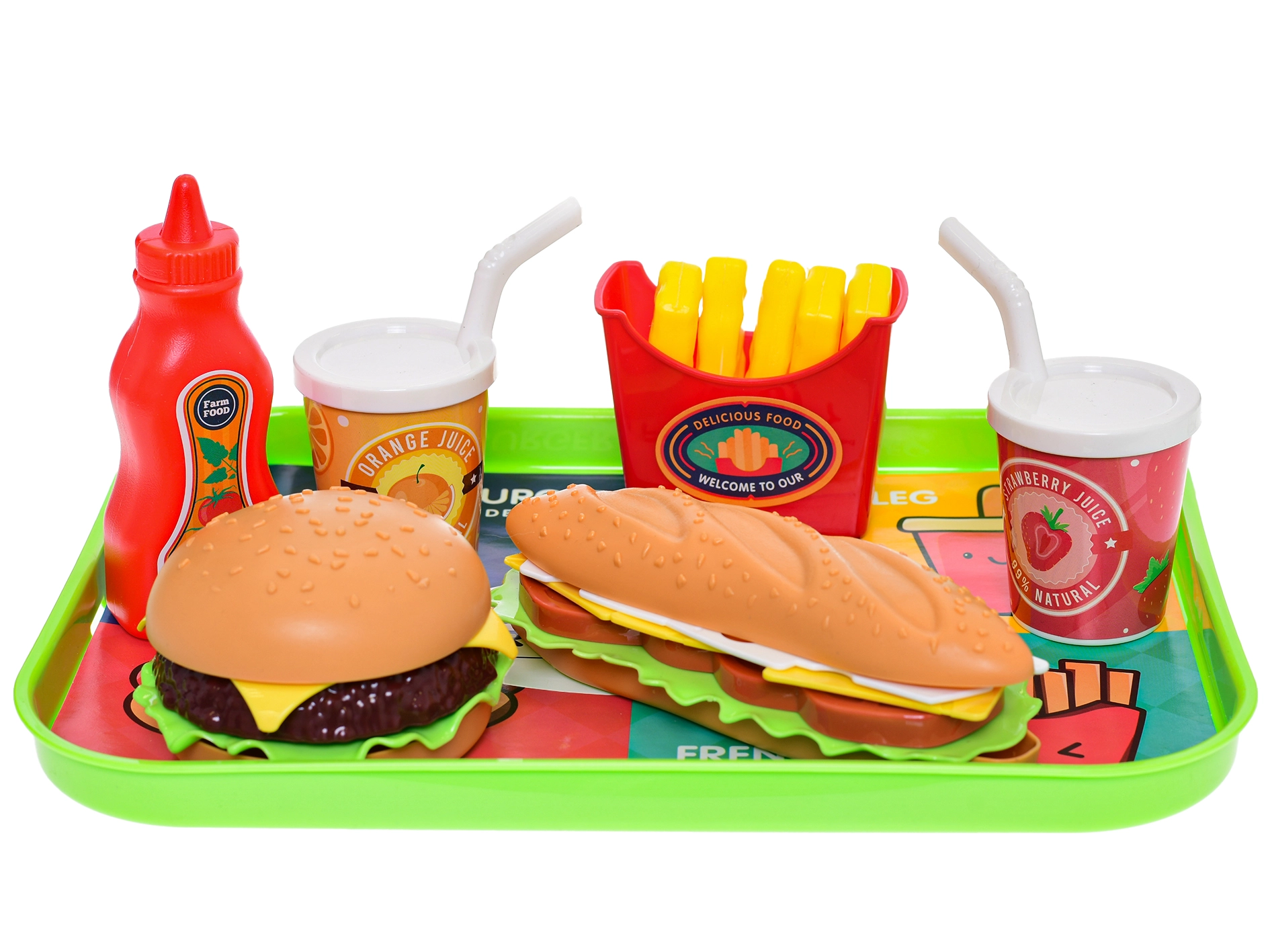 Jouet amusant pour petits chefs : cet ensemble de restauration rapide comprend 6 pièces réalistes de nourriture et de boissons sur un plateau pratique de 26 × 19 cm. Il favorise la motricité fine, la créativité et les compétences sociales lors des jeux de restaurant ou de snack. Fabriqué en plastique de qualité, convient aux enfants dès 3 ans.