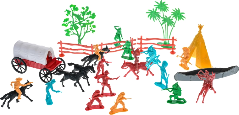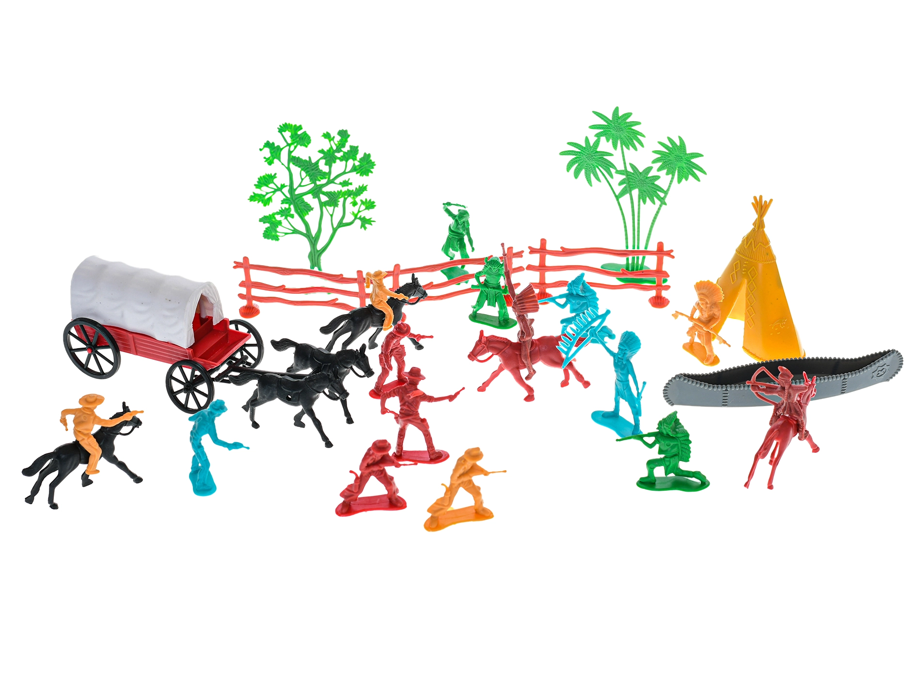 Découvrez le monde du Far West avec cet ensemble riche de 31 figurines qui ravira les petits aventuriers. Vous y trouverez des cow-boys, des Indiens, des chevaux et une diligence, avec lesquels les enfants créeront d’innombrables histoires. Les figurines sont en plastique de qualité, résistantes et sûres pour les enfants dès 3 ans. Stimule l’imagination, développe la créativité et offre des heures de jeu de rôle.