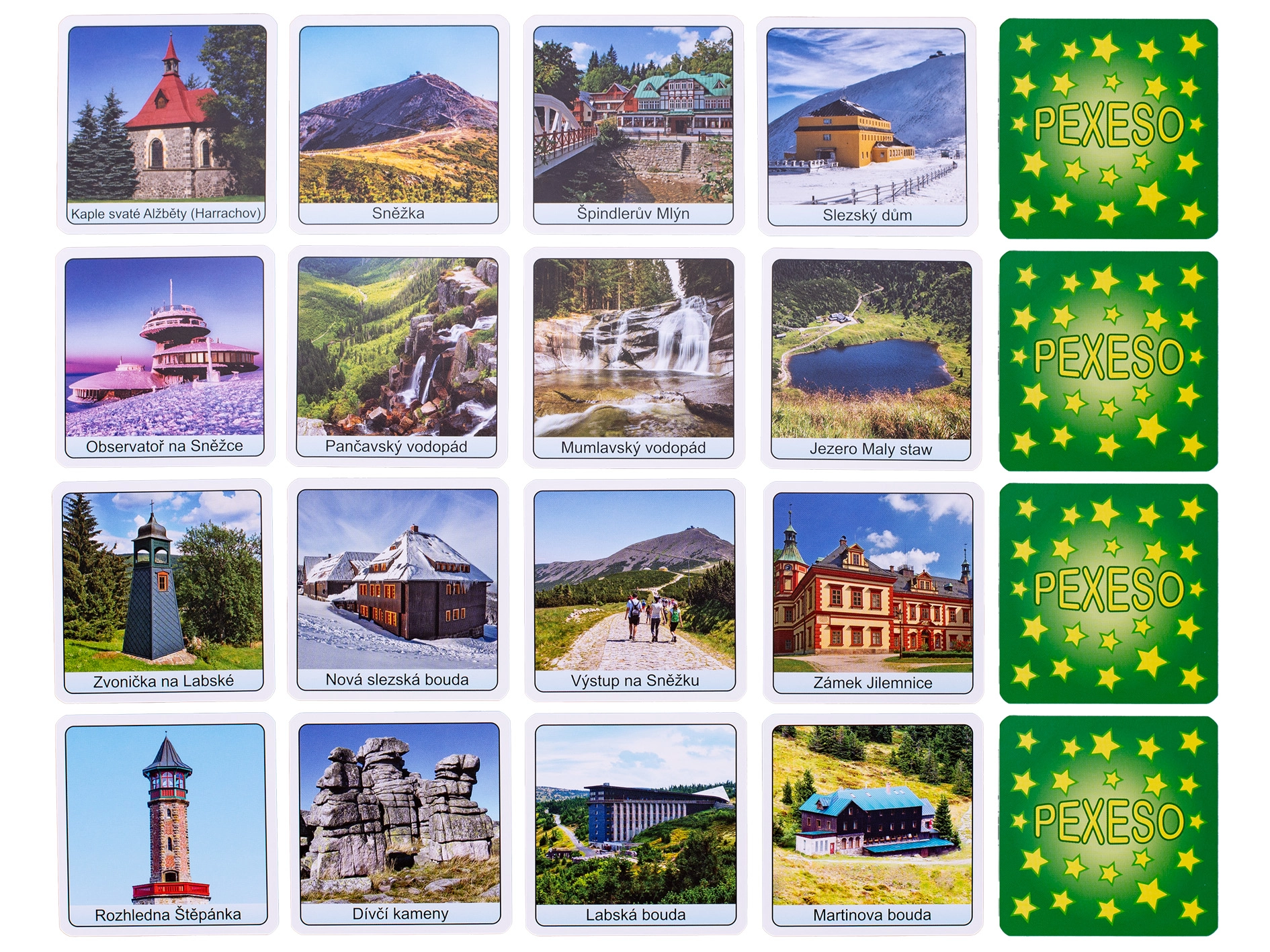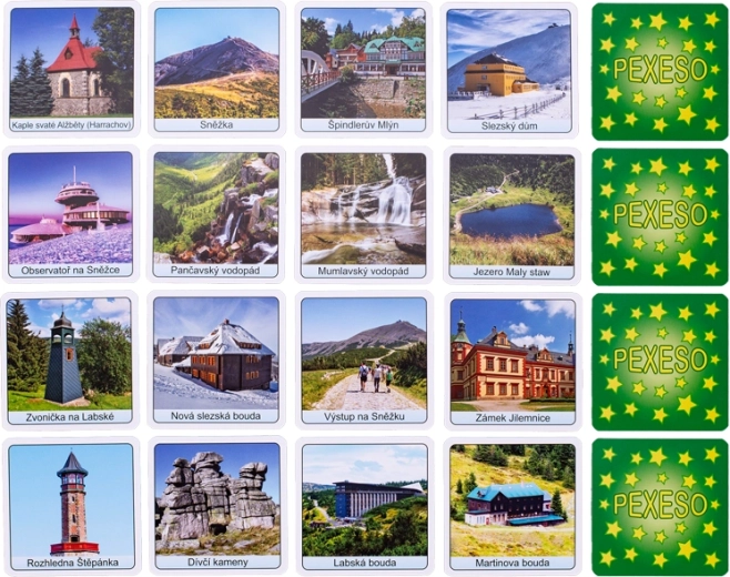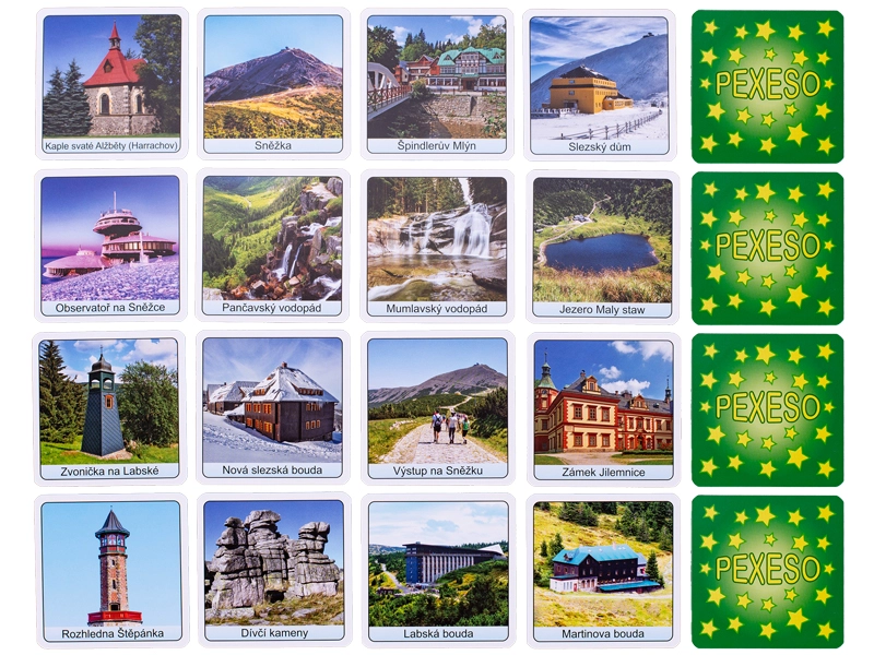Pexeso Krkonoše est un jeu de mémoire apprécié, avec des motifs originaux de la plus haute chaîne de montagnes de Tchéquie. Enfants et adultes y entraînent concentration, mémoire et patience tout en découvrant des lieux pittoresques comme Sněžka, Labský důl ou Černá hora. Grâce à sa boîte compacte, le jeu est le compagnon idéal pour les voyages, les vacances et les escapades du week‑end.