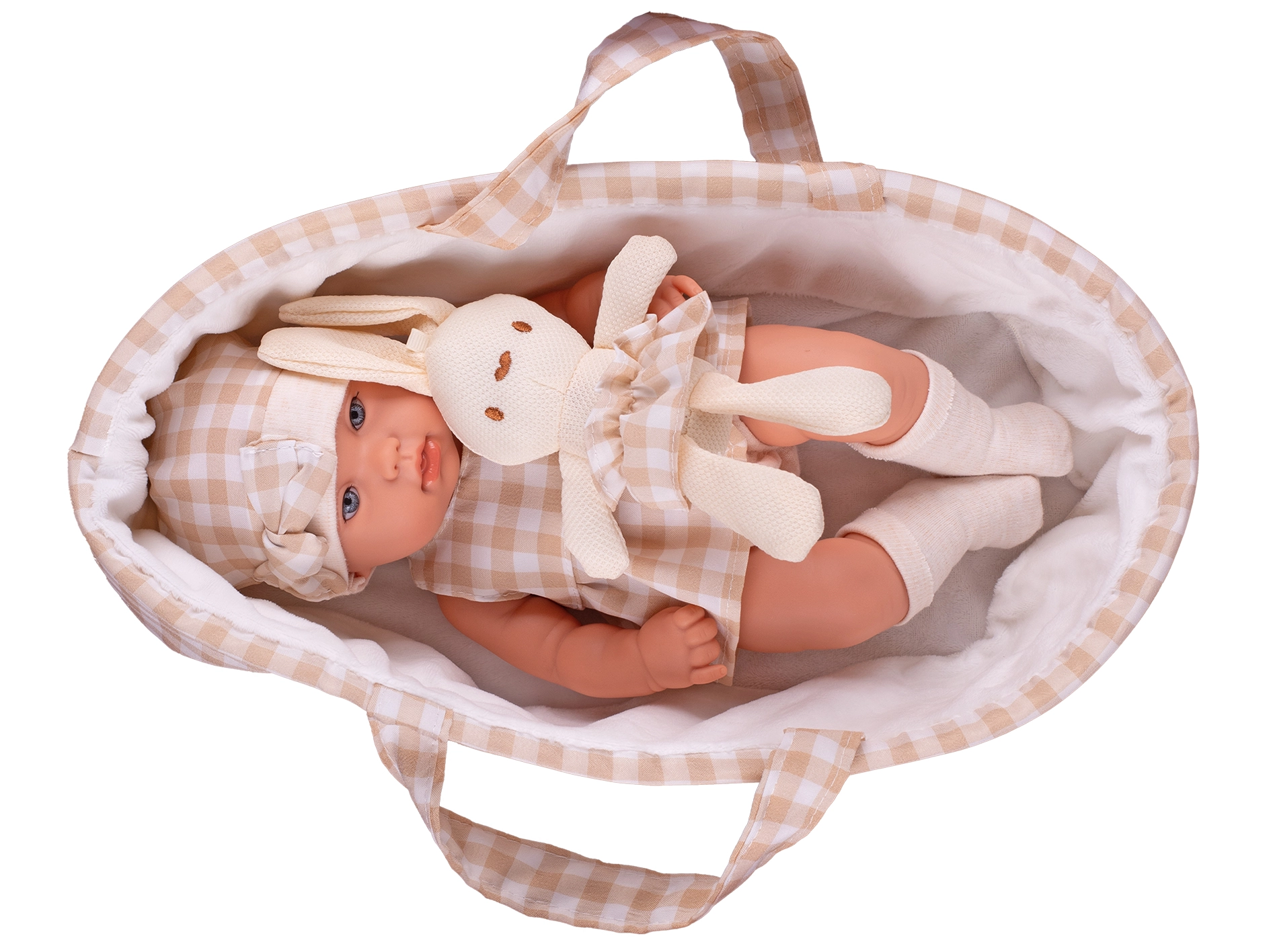 - Coffret complet : poupée, porte-bébé et lapin en peluche assortis dans des nuances beiges.