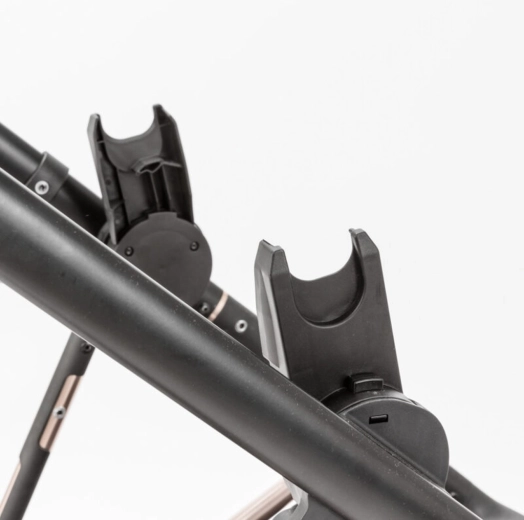 Insérez les adaptateurs dans les fentes de montage du cadre de la poussette jusqu’au clic audible, puis clipsez le siège auto. Avant chaque utilisation, vérifiez la solidité de la fixation. Pour le démontage, retirez d’abord le siège auto conformément à son mode d’emploi et appuyez sur le bouton de déverrouillage des adaptateurs.