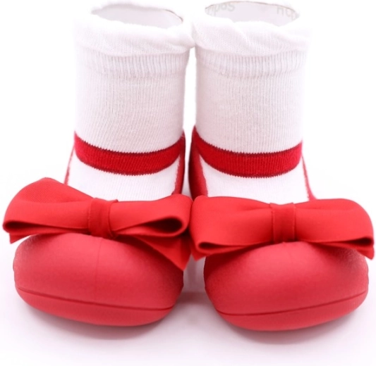 Adorables chaussons pour enfants Attipas Mary Jane de couleur rouge, combinant l’aspect d’une chaussette et d’une chaussure. Ils sont souples, flexibles et respirants, favorisent le développement naturel des petits pieds et, grâce à leur semelle antidérapante, assurent la stabilité des premiers pas. Idéals pour les enfants de 6 mois à 3 ans – à la maison comme à l’extérieur par temps chaud et sec.