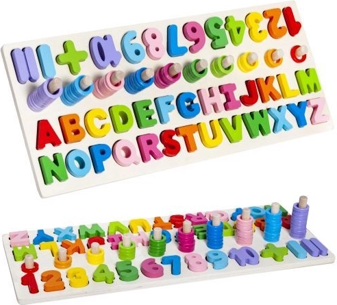Planche éducative en bois colorée avec alphabet, chiffres et anneaux empilables, favorisant l’apprentissage des lettres et du calcul par le jeu. Les enfants développent la motricité fine, la pensée logique et la reconnaissance des couleurs grâce aux pièces amovibles, aux signes mathématiques et aux chevilles avec anneaux. Conception en bois sûre avec peintures non toxiques, idéale pour faire ses premiers pas dans la lecture et les mathématiques.