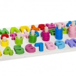 alphabet (A–Z), chiffres (1–10), signes mathématiques, anneaux en plastique, planche en bois avec chevilles