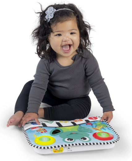 Ce tapis polyvalent combine une jouet musical pour lit bébé et un panneau de jeu actif pour le sol. Grâce à son rembourrage doux, il est idéal pour les nouveau-nés et les tout-petits – du jeu allongé au temps sur le ventre jusqu’aux premières positions assises. Les enfants peuvent donner des coups de pied sur 5 « touches » lumineuses, appuyer sur les boutons et découvrir des sons de marimba, des mélodies et des effets ludiques.
