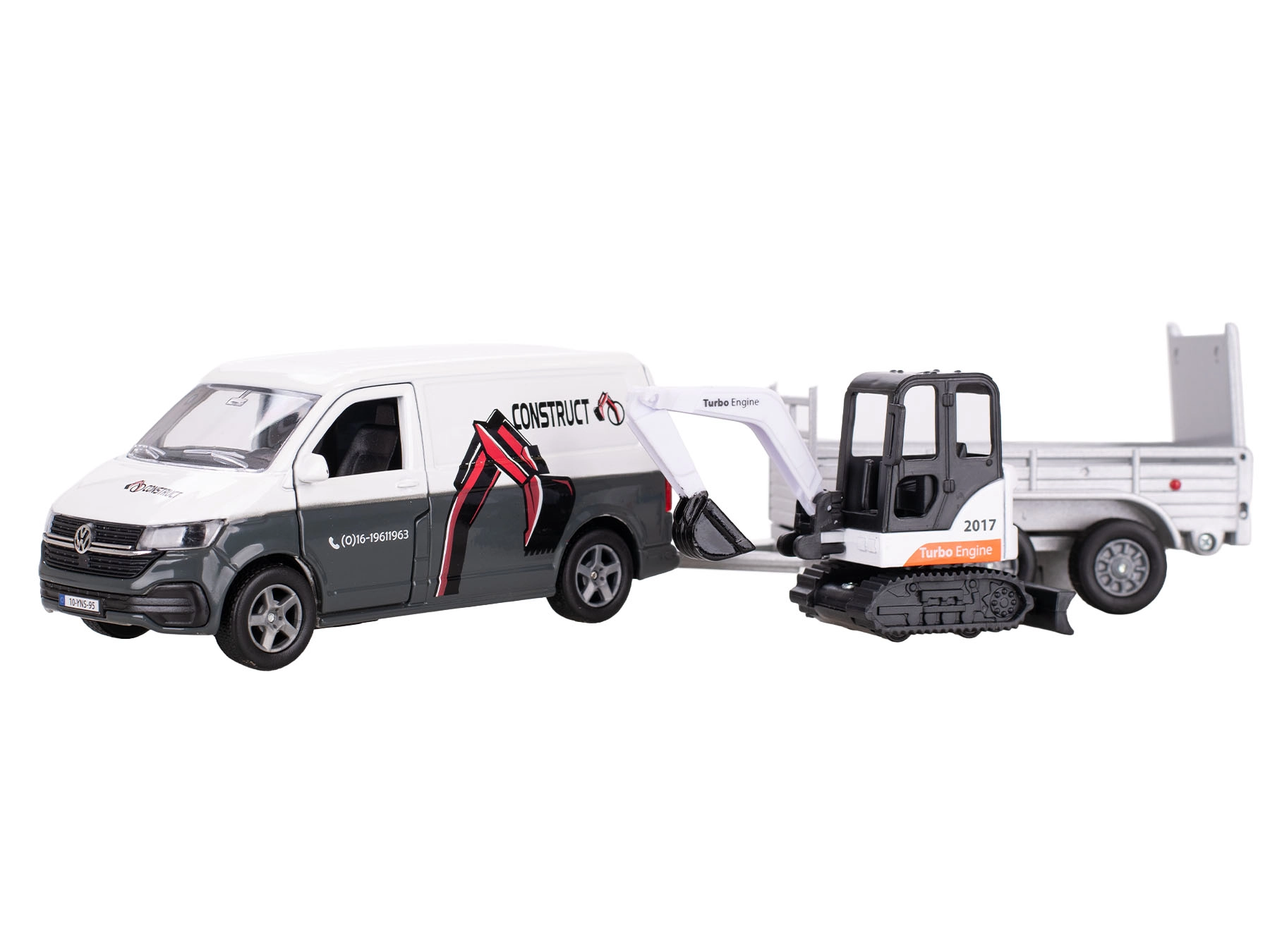 Avec le set Kids Globe Traffic, les enfants créent facilement leur propre chantier. Le VW Transporter réaliste avec mécanisme de retour en arrière transporte en toute sécurité la mini-pelleteuse sur la remorque détachable, prête à commencer immédiatement les travaux de « creusement ». La fabrication robuste en métal et plastique assure une longue durabilité même en cas de jeu intensif.